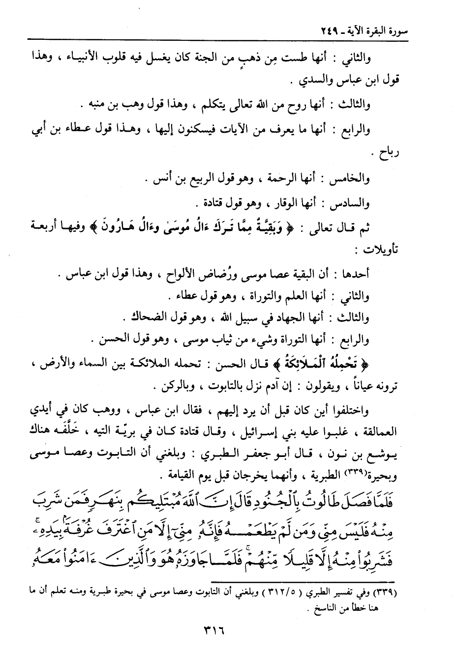 والثاني: أنها طست من ذهبٍ من الجنة كان يغسل فيه قلوب الأنبياء , وهذا قول ابن عباس والسدي. والثالث: أنها روح من الله تعالى يتكلم , وهذا قول وهب بن منبه. والرابع: أنها ما يعرف من الآيات فيسكنون إليها , وهذا قول عطاء بن أبي رباح. والخامس: أنها الرحمة , وهو قول الربيع ابن أنس. والسادس: أنها الوقار , وهو قول قتادة. ثم قال تعالى: {وَبَقِيِّةٌ مِمَّا تَرَكَءَالُ مُوسَى وءَالُ هَارُونَ} وفيها أربعة تأويلات: أحدها: أن البقية عصا موسى ورُضاض الألواح , وهذا قول ابن عباس. والثاني: أنها العلم والتوراة , وهو قول عطاء. والثالث: أنها الجهاد في سبيل الله , وهو قول الضحاك. والرابع: أنها التوراة وشيء من ثياب موسى , وهو قول الحسن. {تَحْمِلُهُ الْمْلاَئِكَةُ} قال الحسن: تحمله الملائكة بين السماء والأرض , ترونه عياناً , ويقولون: إن آدم نزل بالتابوت , وبالركن. واختلفوا أين كان قبل أن يرد إليهم , فقال ابن عباس , ووهب كان في أيدي العمالقة , غلبوا عليه بني إسرائيل , وقال قتادة كان في بريّة التيه , خَلَّفَه هناك يوشع بن نون , قال أبو جعفر الطبري: وبلغني أن التابوت وعصا موسى وبحيرة الطبرية , وأنهما يخرجان قبل يوم القيامة.