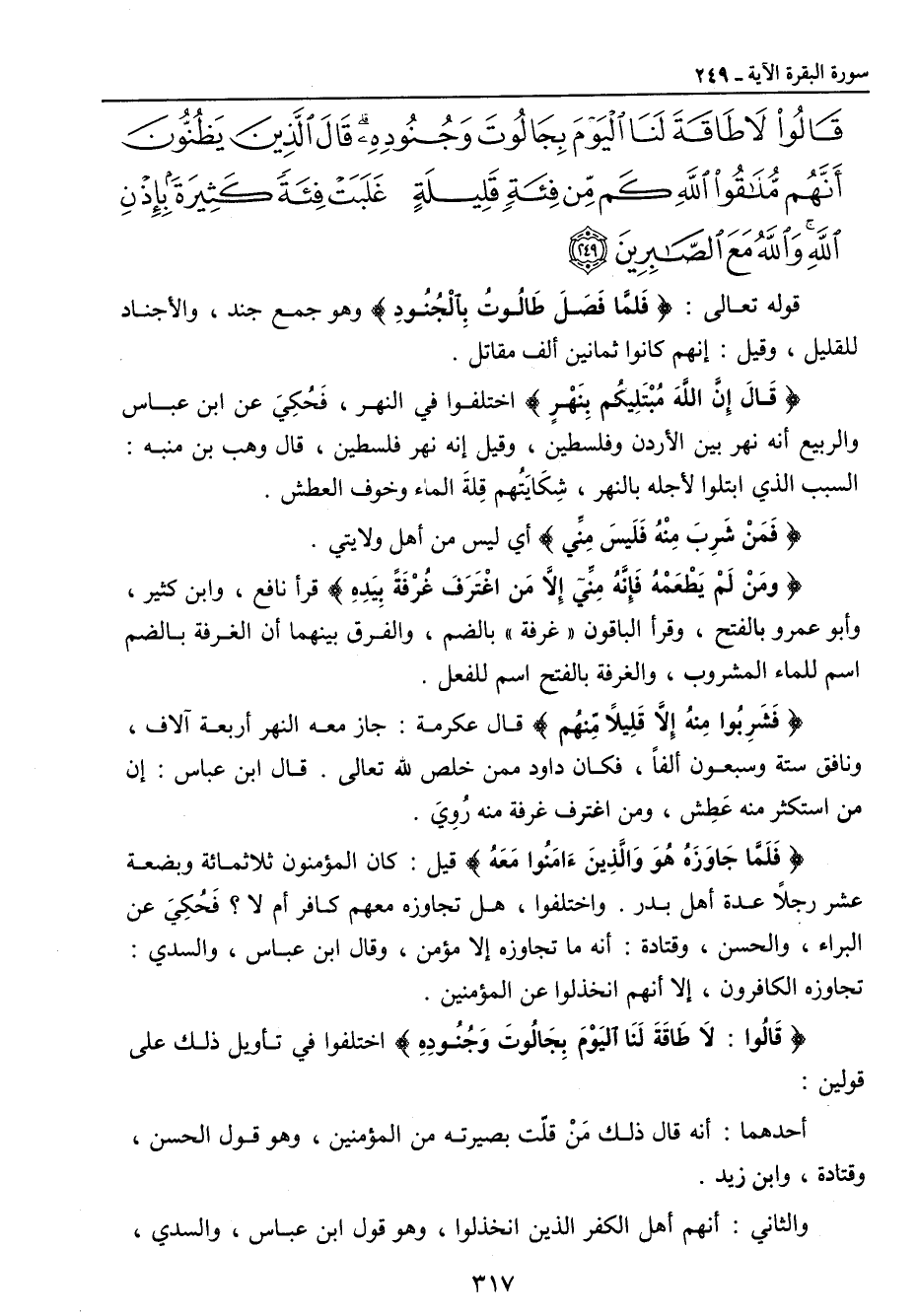 قالوا لا طاقة لنا اليوم بجالوت وجنوده قال الذين يظنون أنهم ملاقوا الله كم من فئة قليلة غلبت فئة كثيرة بإذن الله والله مع الصابرين} قوله تعالى: {فَلمَّا فَصَلَ طَالُوتُ بِالْجُنُودِ} وهو جمع جند , والأجناد للقليل , وقيل: إنهم كانوا ثمانين ألف مقاتل. {قَالَ إِنَّ الله مُبْتَلِيكُم بِنَهْرٍ} اختلفوا في النهر , فَحُكِيَ عن ابن عباس والربيع أنه نهر بين الأردن وفلسطين , وقيل إنه نهر فلسطين , قال وهب بن منبه: السبب الذي ابتلوا لأجله بالنهر , شِكَايَتُهم قِلةَ الماء وخوف العطش. {فَمَنْ شَرِبَ مِنْهُ فَلَيسَ مِنِّي} أي ليس من أهل ولايتي. {ومَنْ لَمْ يَطْعَمْهُ فَإِنَّهُ مِنِّي إِلاَّ مَن اغْتَرَفَ غُرْفَةً بِيَدِهِ} قرأ نافع , وابن كثير , وأبو عمرو بالفتح , وقرأ الباقون (غرفة) بالضم , والفرق بينهما أن الغرفة بالضم اسم للماء المشروب , والغرفة بالفتح اسم للفعل. {فَشَرِبُوا مِنهُ إِلاَّ قَلِيلاً مِّنهُم} قال عكرمة: جاز معه النهر أربعة آلاف , ونافق ستة وسبعون ألفاً , فكان داود ممن خلص لله تعالى. قال ابن عباس: إن من استكثر منه عَطِش , ومن اغترف غرفة منه رُوِيَ. {فَلَمَّا جَاوَزَهُ هُوَ وَالَّذِينَءَامَنُوا مَعَهُ} قيل: كان المؤمنون ثلاثمائة وبضعة عشر رجلاً عدة أهل بدر. واختلفوا , هل تجاوزه معهم كافر أم لا؟ فَحُكِيَ عن البراء , والحسن , وقتادة: أنه ما تجاوزه إلا مؤمن , وقال ابن عباس , والسدي: تجاوزه الكافرون , إلا أنهم انخذلوا عن المؤمنين. {قَالُوا: لاَ طَاقَةَ لَنَا اليَوْمَ بِجَالُوتَ وَجُنُودِهِ} اختلفوا في تأويل ذلك على قولين: أحدهما: أنه قال ذلك مَنْ قلّت بصيرته من المؤمنين , وهو قول الحسن , وقتادة , وابن زيد. والثاني: أنهم أهل الكفر الذين انخذلوا , وهو قول ابن عباس , والسدي ,