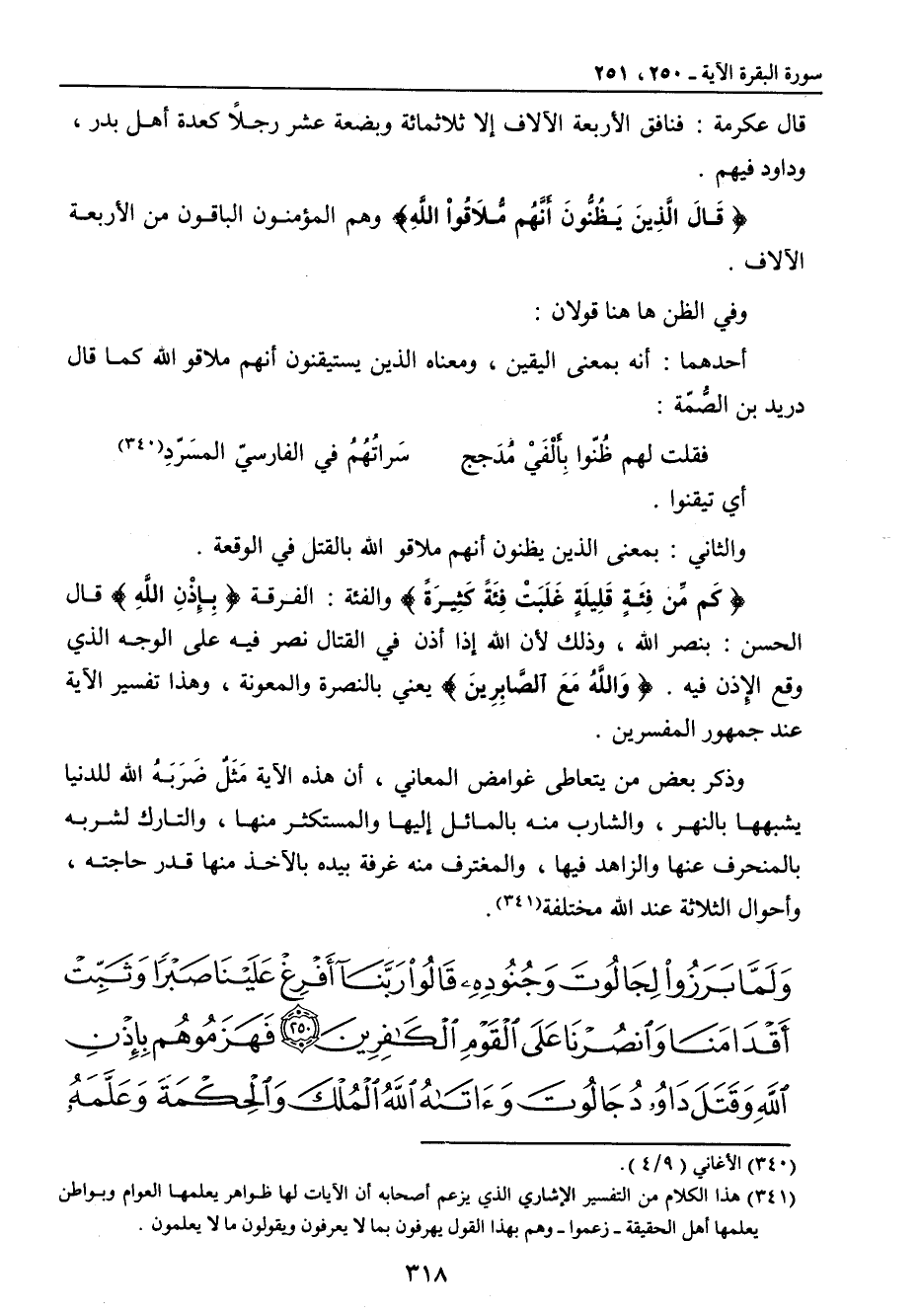 أي تيقنوا. والثاني: بمعنى الذين يظنون أنهم ملاقوا الله بالقتل في الوقعة. {كَم مِّن فِئَةٍ قَلِيلَةٍ غَلَبَتْ فِئَةً كَثِيرَةً} والفئة: الفرقة {بِإِذْنِ اللهِ} قال الحسن: بنصر الله , وذلك لأن الله إذا أذن في القتال نصر فيه على الوجه الذي وقع الإِذن فيه. {وَاللَّهُ مَعَ الصَّابِرِينَ} يعني بالنصرة والمعونة , وهذا تفسير الآية عند جمهور المفسرين. وذكر بعض من يتعاطى غوامض المعاني , أن هذه الآية مَثَلٌ ضَرَبَهُ الله للدنيا يشبهها بالنهر , والشارب منه بالمائل إليها والمستكثر منها , والتارك لشربه بالمنحرف عنها والزاهد فيها , والمغترف منه بيده بالآخذ منها قدر حاجته , وأحوال الثلاثة عند الله مختلفة.