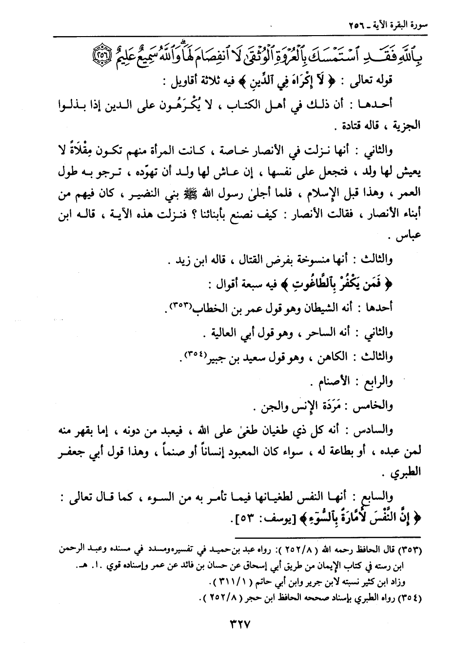 بالله فقد استمسك بالعروة الوثقى لا انفصام لها والله سميع عليم} قوله تعالى: {لآَ إِكْرَاهَ فِي الدِّينِ} فيه ثلاثة أقاويل: أحدها: أن ذلك في أهل الكتاب , لا يُكْرَهُون على الدين إذا بذلوا الجزية , قاله قتادة. والثاني: أنها نزلت في الأنصار خاصة , كانت المرأة منهم تكون مِقْلاَةً لا يعيش لها ولد , فتجعل على نفسها , إن عاش لها ولد أن تهوّده , ترجو به طول العمر , وهذا قبل الإسلام , فلما أجلى رسول الله صلى الله عليه وسلم بني النضير , كان فيهم من أبناء الأنصار , فقالت الأنصار: كيف نصنع بأبنائنا؟ فنزلت هذه الآية , قاله ابن عباس. والثالث: أنها منسوخة بفرض القتال , قاله ابن زيد. {فَمَن يَكْفُرُ بِالطَّاغُوتِ} فيه سبعة أقوال: أحدها: أنه الشيطان وهو قول عمر بن الخطاب. والثاني: أنه الساحر , وهو قول أبي العالية. والثالث: الكاهن , وهو قول سعيد بن جبير. والرابع: الأصنام. والخامس: مَرَدَة الإنس والجن. والسادس: أنه كل ذي طغيان طغى على الله , فيعبد من دونه , إما بقهر منه لمن عبده , أو بطاعة له , سواء كان المعبود إنساناً أو صنماً , وهذا قول أبي جعفر الطبري. والسابع: أنها النفس لطغيانها فيما تأمر به من السوء , كما قال تعالى: {إِنَّ النَّفْسَ لأَمَّارَةٌ بِالسُّوءِ} [يوسف: 53].