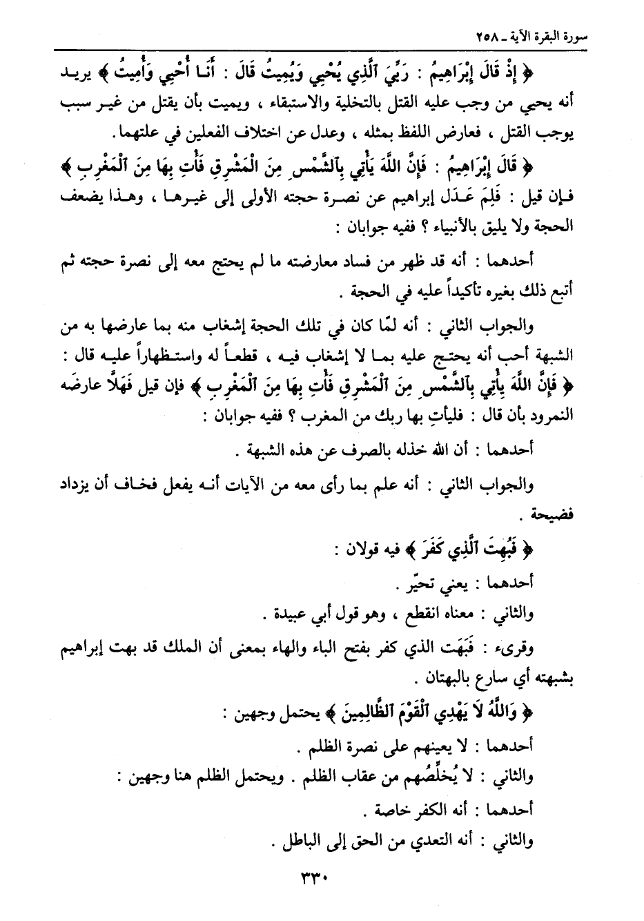 {إِذْ قَالَ إِبْرَاهِيمُ: رَبِّيَ الَّذِي يُحْيِي وَيُمِيتُ قَالَ: أَنَا أُحْي وَأُمِيتُ} يريد أنه يحيي من وجب عليه القتل بالتخلية والاستبقاء , ويميت بأن يقتل من غير سبب يوجب القتل , فعارض اللفظ بمثله , وعدل عن اختلاف الفعلين في علتهما. {قَالَ إِبْرَاهِيمُ: فإنَّ اللهَ يَأْتي بِالشَّمْسِ مِنَ الْمَشْرِقِ فَأْتِ بِهَا مِنَ الْمَغرِبِ} فإن قيل: فَلِمَ عَدَل إبراهيم عن نصرة حجته الأولى إلى غيرها , وهذا يضعف الحجة ولا يليق بالأنبياء؟ ففيه جوابان: أحدهما: أنه قد ظهر من فساد معارضته ما لم يحتج معه إلى نصرة حجته ثم أتبع ذلك بغيره تأكيداً عليه في الحجة. والجواب الثاني: أنه لمّا كان في تلك الحجة إشغاب منه بما عارضها به من الشبهة أحب أنه يحتج عليه بما لا إشغاب فيه , قطعاً له واستظهاراً عليه قال: {فإنَّ اللهَ يَأْتي بِالشَّمْسِ مِنَ الْمَشْرِقِ فَأْتِ بِهَا مِنَ الْمَغرِبِ} فإن قيل فَهَلاَّ عارضه النمرود بأن قال: فليأت بها ربك من المغرب؟ ففيه جوابان: أحدهما: أن الله خذله بالصرف عن هذه الشبهة. والجواب الثاني: أنه علم بما رأى معه من الآيات أنه يفعل فخاف أن يزداد فضيحة. {فَبُهِتَ الَّذِي كَفَرَ} فيه قولان: أحدهما: يعني تحيّر. والثاني: معناه انقطع , وهو قول أبي عبيدة. وقرئ: فَبَهَت الذي كفر بفتح الباء والهاء بمعنى أن الملك قد بهت إبراهيم بشبهته أي سارع بالبهتان. {واللهُ لاَ يَهْدِي الْقَوْمَ الظَّالِمِينَ} يحتمل وجهين: أحدهما: لا يعينهم على نصرة الظلم. والثاني: لا يُخلِّصُهم من عقاب الظلم. ويحتمل الظلم هنا وجهين: أحدهما: أنه الكفر خاصة. والثاني: أنه التعدي من الحق إلى الباطل.