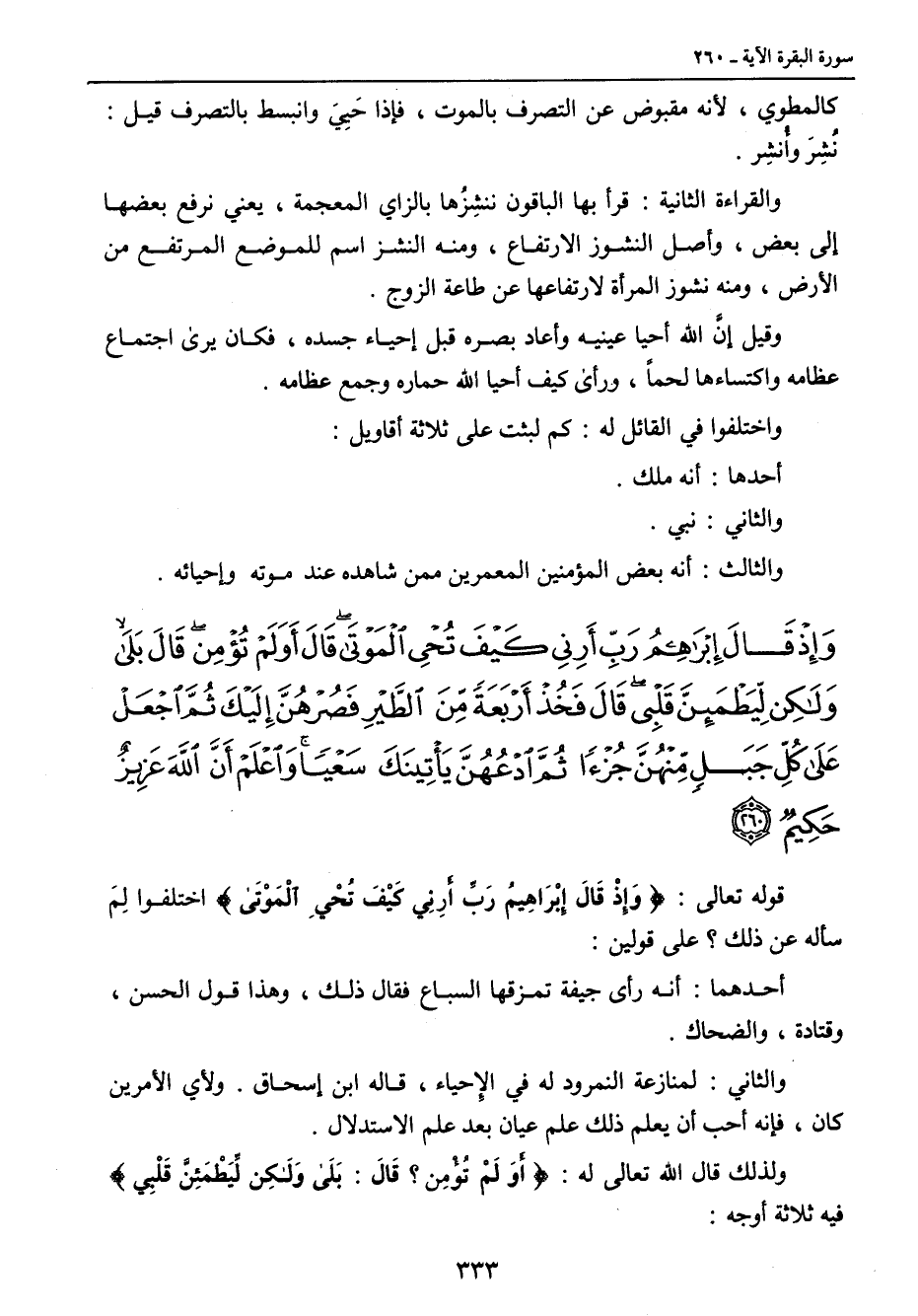{وإذ قال إبراهيم رب أرني كيف تحيي الموتى قال أو لم تؤمن قال بلى ولكن ليطمئن قلبي قال فخذ أربعة من الطير فصرهن إليك ثم اجعل على كل جبل منهن جزءا ثم ادعهن يأتينك سعيا واعلم أن الله عزيز حكيم} قوله تعالى: {وَإِذْ قَالَ إِبْرَاهِيمُ رَبِّ أَرِنِي كَيْفَ تُحْي الْمَوْتَى} اختلفوا لِمَ سأله عن ذلك؟ على قولين: أحدهما: أنه رأى جيفة تمزقها السباع فقال ذلك , وهذا قول الحسن , وقتادة , والضحاك. والثاني: لمنازعة النمرود له في الإحياء , قاله ابن إسحاق. ولأي الأمرين كان , فإنه أحب أن يعلم ذلك علم عيان بعد علم الاستدلال. ولذلك قال الله تعالى له: {أَوَلَمْ تُؤْمِن؟ قَالَ: بَلَى وَلَكِن لِّيَطْمَئِنَّ قَلْبِي} فيه ثلاثة أوجه: