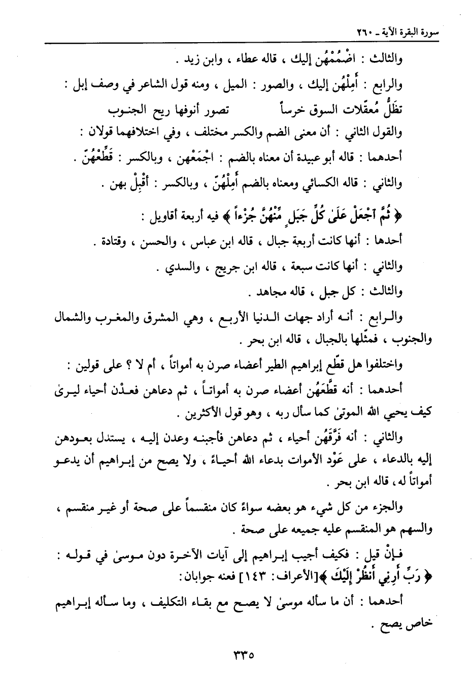 والقول الثاني: أن معنى الضم والكسر مختلف , وفي اختلافهما قولان: أحدهما: قاله أبو عبيدة أن معناه بالضم: اجْمَعْهن , وبالكسر: قَطِّعْهُنّ. والثاني: قاله الكسائي ومعناه بالضم أَمِلْهُنّ , وبالكسر: أقْبِلْ بهن. {ثُمَّ اجْعَلْ عَلَى كُلِّ جَبَلٍ مِّنْهُنَّ جُزْءاً} فيه أربعة أقاويل: أحدها: أنها كانت أربعة جبال , قاله ابن عباس , والحسن , وقتادة. والثاني: أنها كانت سبعة , قاله ابن جريج , والسدي. والثالث: كل جبل , قاله مجاهد. والرابع: أنه أراد جهات الدنيا الأربع , وهي المشرق والمغرب والشمال والجنوب , فمثّلها بالجبال , قاله ابن بحر. واختلفوا هل قطّع إبراهيم الطير أعضاء صرن به أمواتاً , أم لا؟ على قولين: أحدهما: أنه قطَّعَهُن أعضاء صرن به أمواتاً , ثم دعاهن فعدْن أحياء ليرى كيف يحيي الله الموتى كما سأل ربه , وهو قول الأكثرين. والثاني: أنه فَرَّقَهُن أحياء , ثم دعاهن فأجبنه وعدن إليه , يستدل بعودهن إليه بالدعاء , على عَوْد الأموات بدعاء الله أحياءً , ولا يصح من إبراهيم أن يدعو أمواتاً له , قاله ابن بحر. والجزء من كل شيء هو بعضه سواءً كان منقسماً على صحة أو غير منقسم , والسهم هو المنقسم عليه جميعه على صحة. فإنْ قيل: فكيف أجيب إبراهيم إلى آيات الآخرة دون موسى في قوله: {رَبِّ أَرِنِي أَنظُرْ إِلَيْكَ} [الأعراف: 143] فعنه جوابان: أحدهما: أن ما سأله موسى لا يصح مع بقاء التكليف , وما سأله إبراهيم خاص يصح.