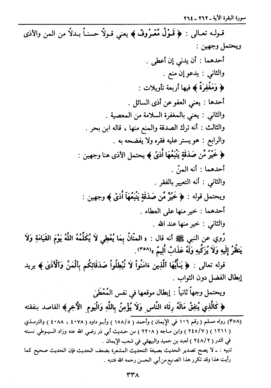 قوله تعالى: {قَوْلٌ مَّعْرُوفٌ} يعني قولاً حسناً بدلاً من المن والأذى ويحتمل وجهين: أحدهما: أن يدني إن أعطى. والثاني: يدعو إن منع. {وَمَغْفِرَةٌ} فيها أربعة تأويلات: أحدها: يعني العفو عن أذى السائل. والثاني: يعني بالمغفرة السلامة من المعصية. والثالث: أنه ترك الصدقة والمنع منها , قاله ابن بحر. والرابع: هو يستر عليه فقره ولا يفضحه به. {خَيْرٌ مِّن صَدَقَةٍ يَتْبَعُهَآ أَذىً} يحتمل الأذى هنا وجهين: أحدهما: أنه المنّ. والثاني: أنه التعيير بالفقر. ويحتمل قوله: {خَيْرٌ مِّن صَدَقَةٍ يَتْبَعُهَآ أَذىً} وجهين: أحدهما: خير منها على العطاء. والثاني: خير منها عند الله. رُوي عن النبي صلى الله عليه وسلم أنه قال: (المنّانُ بِمَا يُعْطِي لاَ يُكَلِّمُهُ اللهُ يَوْمَ القَيَامَةِ وَلاَ يَنظُرُ إِلَيهِ وَلاَ يُزَكِّيهِ وَلَهُ عَذَابٌ أَلِيمٌ). قوله تعالى: {يَأَيُّهَا الَّذِينَءَامَنُواْ لاَ تُبْطِلُواْ صَدَقَاتِكُم بِالْمَنِّ وَالأَذَى} يريد إبطال الفضل دون الثواب. ويحتمل وجهاً ثانياً: إبطال موقعها في نفس المُعْطَى. {كَالَّذِي يُنفِقُ مَالَهُ رِئَاءَ النَّاسِ وَلاَ يُؤْمِنُ بِاللهِ وَاليَوْمِ الأَخِرِ} القاصد بنفقته