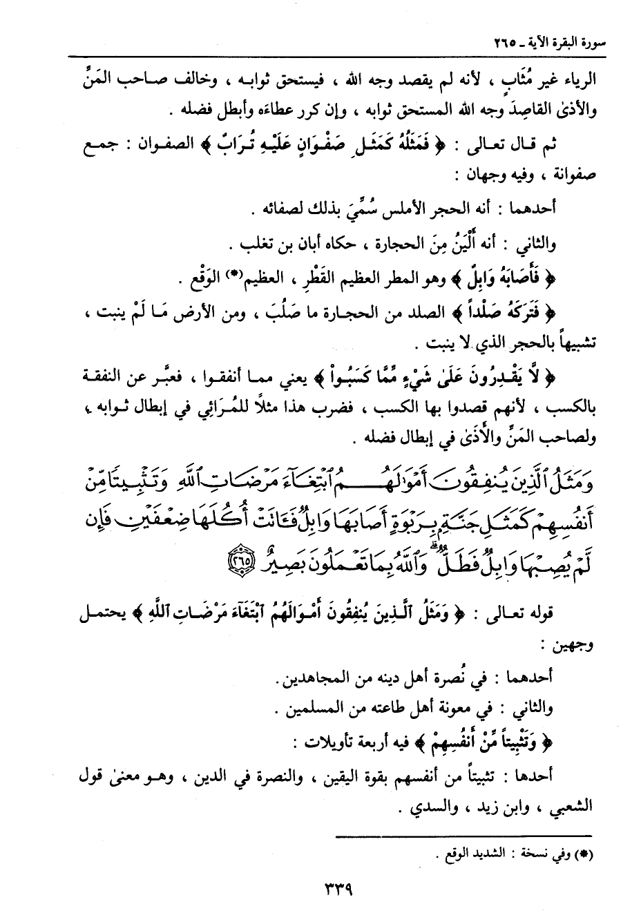 {ومثل الذين ينفقون أموالهم ابتغاء مرضات الله وتثبيتا من أنفسهم كمثل جنة بربوة أصابها وابل فآتت أكلها ضعفين فإن لم يصبها وابل فطل والله بما تعملون بصير} قوله تعالى: {وَمَثَلُ الَّذِينَ يُنفِقُونَ أَمْوَلَهُمُ ابْتِغَآءَ مَرْضَاتِ اللهِ} يحتمل وجهين: أحدهما: في نُصرة أهل دينه من المجاهدين. والثاني: في معونة أهل طاعته من المسلمين. {وَتَثْبِيتاً مِّنْ أَنفُسِهِمْ} فيه أربعة تأويلات: أحدها: تثبيتاً من أنفسهم بقوة اليقين , والنصرة في الدين , وهو معنى قول الشعبي , وابن زيد , والسدي.