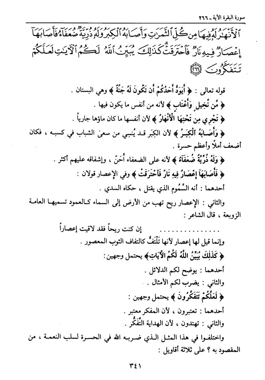 وإنما قيل لها إعصار لأنها تَلْتَفُّ كالتفاف الثوب المعصور. {كَذَلِكَ يُبَيِّنُ اللهُ لَكُمُ الآْيَاتِ} يحتمل وجهين: أحدهما: يوضح لكم الدلائل. والثاني: يضرب لكم الأمثال. {لَعَلَّكُمْ تَتَفَكَّرُونَ} يحتمل وجهين: أحدهما: تعتبرون , لأن المفكر معتبر. والثاني: تهتدون , لأن الهداية التَّفَكُّر. واختلفوا في هذا المثل الذي ضربه الله في الحسرة لسلب النعمة , من المقصود به؟ على ثلاثة أقاويل: