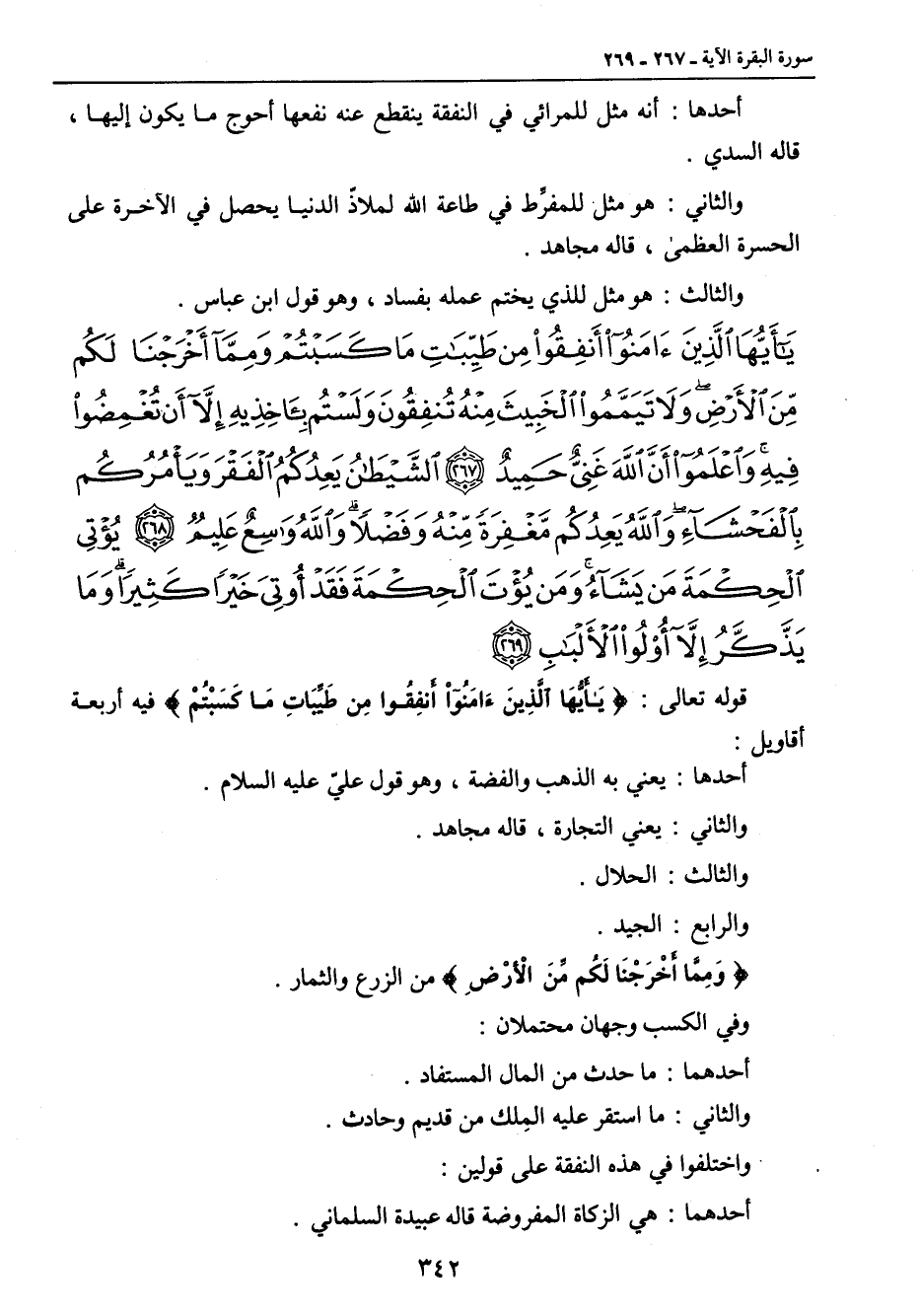 {يا أيها الذين آمنوا أنفقوا من طيبات ما كسبتم ومما أخرجنا لكم من الأرض ولا تيمموا الخبيث منه تنفقون ولستم بآخذيه إلا أن تغمضوا فيه واعلموا أن الله غني حميد الشيطان يعدكم الفقر ويأمركم بالفحشاء والله يعدكم مغفرة منه وفضلا والله واسع عليم يؤتي الحكمة من يشاء ومن يؤت الحكمة فقد أوتي خيرا كثيرا وما يذكر إلا أولوا الألباب} قوله تعالى: {يَأَيُّهَا الَّذِينَءَامَنُواْ أَنفِقُواْ مِن طَيِّبَاتِ مَا كَسَبْتُمْ} فيه أربعة أقاويل: أحدها: يعني به الذهب والفضة , وهو قول عليّ عليه السلام. والثاني: يعني التجارة , قاله مجاهد. والثالث: الحلال. والرابع: الجيد. {وَمِمَّآ أَخْرَجْنَا لَكُم مِّنَ الأَرْضِ} من الزرع والثمار. وفي الكسب وجهان محتملان: أحدهما: ما حدث من المال المستفاد. والثاني: ما استقر عليه المِلك من قديم وحادث. واختلفوا في هذه النفقة على قولين: أحدهما: هي الزكاة المفروضة قاله عبيدة السلماني.