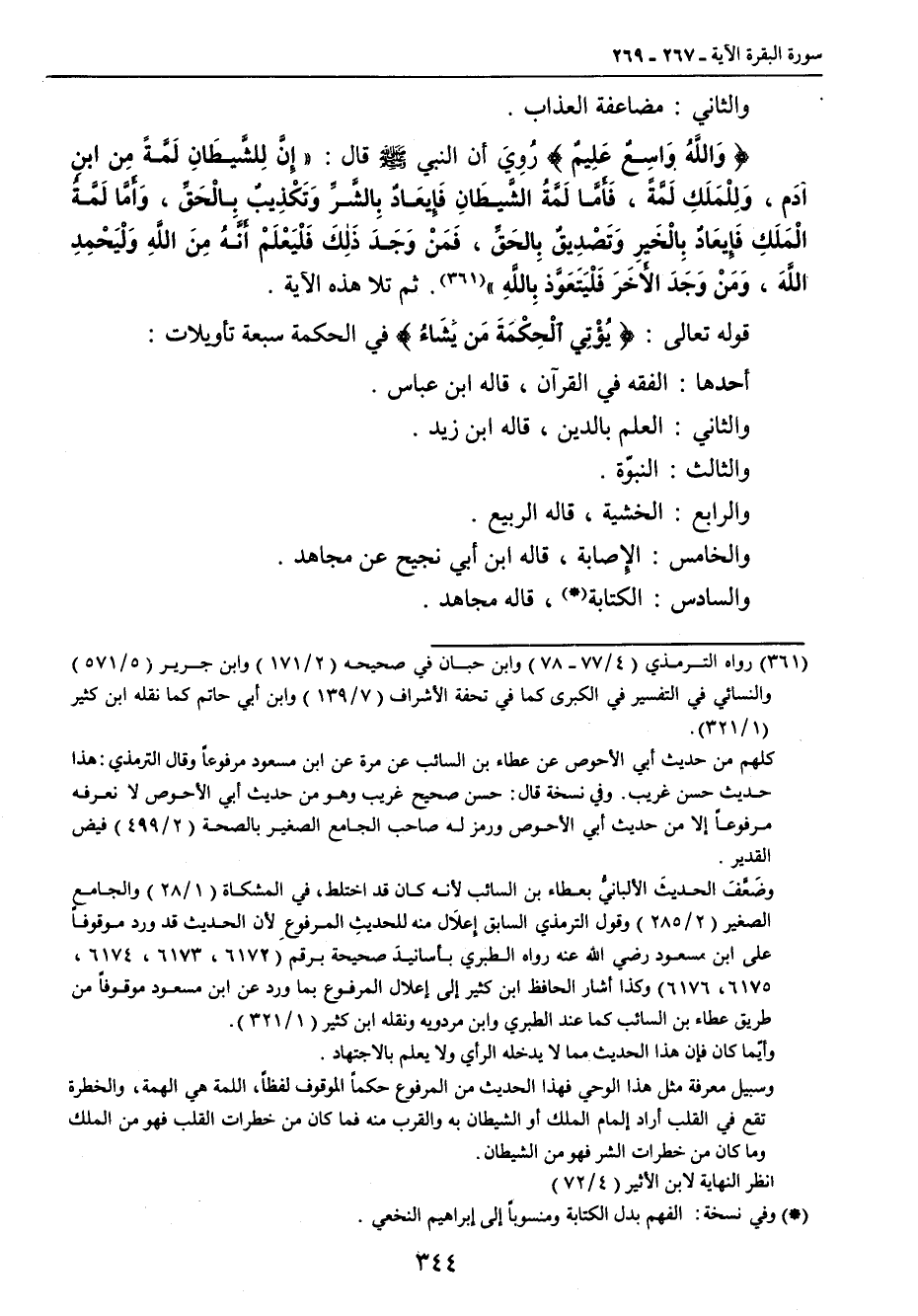 والثاني: مضاعفة العذاب. {وَاللهُ وَاسِعٌ عَلِيمٌ} رُوِيَ أن النبي صلى الله عليه وسلم قال: (إِنَّ لِلشَّيطَانِ لَمَّةً مِن ابن آدَم , وَلِلْمَلَكِ لَمَّةً , فَأَمَّا لَمَّةُ الشَّيطَانِ فَإِيعَادٌ بِالشَّرِّ وَتَكْذِيبٌ بِالْحَقِّ , وَأَمَّا لَمَّةُ الْمَلَكِ فَإِيعَادٌ بِالْخَيرِ وَتَصْدِيقٌ بِالحَقِّ , فَمَنْ وَجَدَ ذَلِكَ فَلْيَعْلَمْ أَنَّهُ مِنَ اللهِ وَلْيَحْمِدِ اللهَ , وَمَنْ وَجَدَ الأخَرَ فَلْيَتَعَوَّذ بِاللهِ). ثم تلا هذه الآية. قوله تعالى: {يُؤْتِي الْحِكْمَةَ مَن يَشَاءُ} في الحكمة سبعة تأويلات: أحدها: الفقه في القرآن , قاله ابن عباس. والثاني: العلم بالدين , قاله ابن زيد. والثالث: النبوّة. والرابع: الخشية , قاله الربيع. والخامس: الإصابة , قاله ابن أبي نجيح عن مجاهد. والسادس: الكتابة , قاله مجاهد.