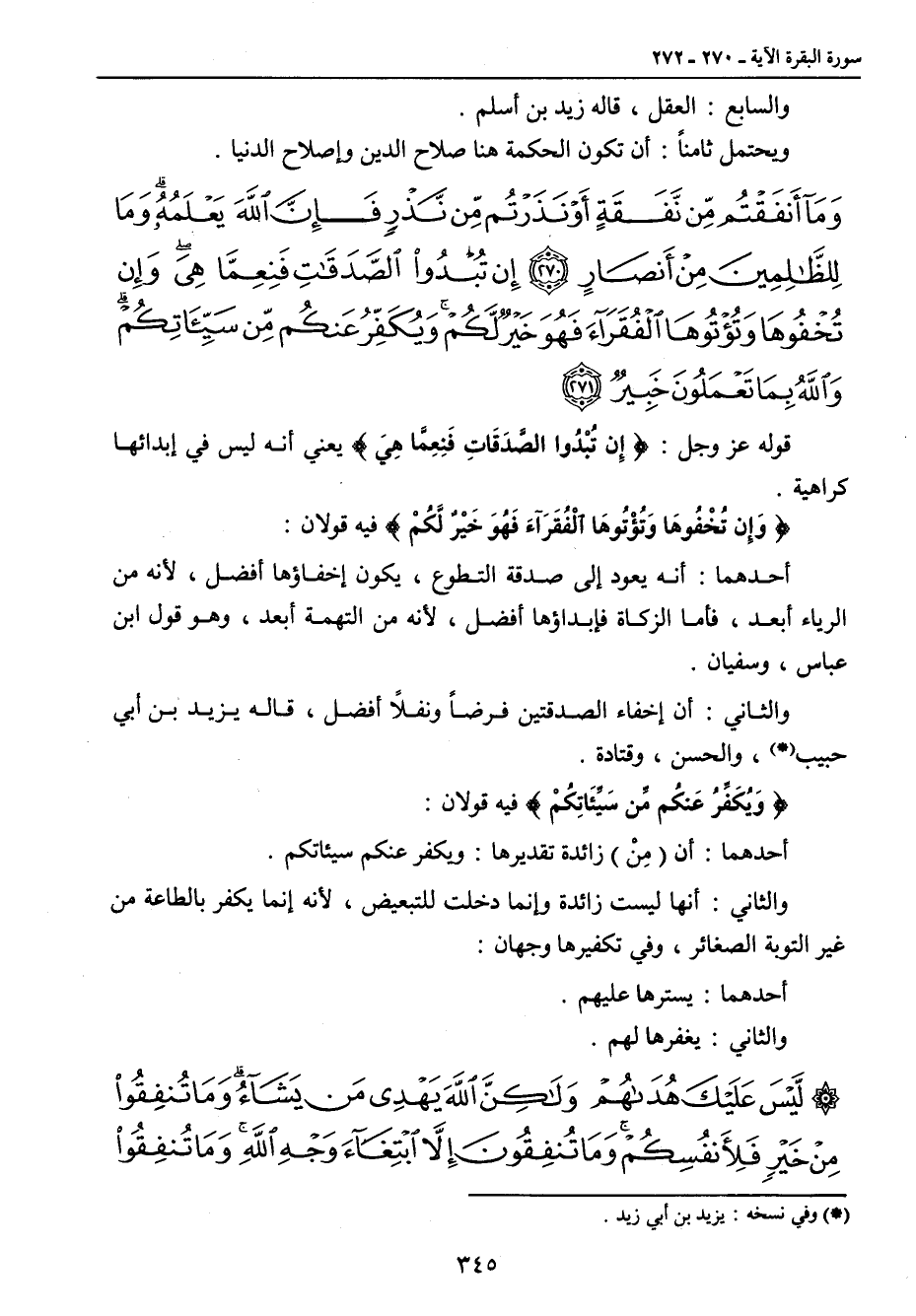 {وما أنفقتم من نفقة أو نذرتم من نذر فإن الله يعلمه وما للظالمين من أنصار إن تبدوا الصدقات فنعما هي وإن تخفوها وتؤتوها الفقراء فهو خير لكم ويكفر عنكم من سيئاتكم والله بما تعملون خبير} قوله عز وجل: {إِن تُبْدُوا الصَّدَقَاتِ فَنِعِمَّا هِيَ} يعني أنه ليس في إبدائها كراهية. {وَإِن تُخْفُوهَا وَتُؤْتُوهَا الْفُقَرَآءَ فَهُوَ خَيْرٌ لَّكُمْ} فيه قولان: أحدهما: أنه يعود إلى صدقة التطوع , يكون إخفاؤها أفضل , لأنه من الرياء أبعد , فأما الزكاة فإبداؤها أفضل , لأنه من التهمة أبعد , وهو قول ابن عباس , وسفيان. والثاني: أن إخفاء الصدقتين فرضاً ونفلاً أفضل , قاله يزيد بن أبي حبيب , والحسن , وقتادة. {وَيُكَفِّرُ عَنكُم مِّن سَيِّئَاتِكُمْ} فيه قولان: أحدهما: أن (مِنْ) زائدة تقديرها: ويكفر عنكم سيئاتكم. والثاني: أنها ليست زائدة وإنما دخلت للتبعيض , لأنه إنما يكفر بالطاعة من غير التوبة الصغائر , وفي تكفيرها وجهان: أحدهما: يسترها عليهم. والثاني: يغفرها لهم.