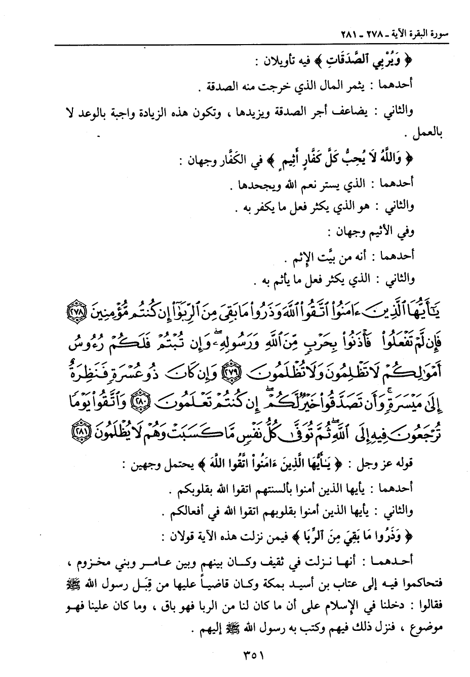 {يا أيها الذين آمنوا اتقوا الله وذروا ما بقي من الربا إن كنتم مؤمنين فإن لم تفعلوا فأذنوا بحرب من الله ورسوله وإن تبتم فلكم رؤوس أموالكم لا تظلمون ولا تظلمون وإن كان ذو عسرة فنظرة إلى ميسرة وأن تصدقوا خير لكم إن كنتم تعلمون واتقوا يوما ترجعون فيه إلى الله ثم توفى كل نفس ما كسبت وهم لا يظلمون} قوله عز وجل: {يَأَيُّهَا الَّذِينَءَامَنُواْ اتَّقُواْ اللهَ} يحتمل وجهين: أحدهما: يأ أيها الذين أمنوا بألسنتهم اتقوا الله بقلوبكم. والثاني: يأيها الذين أمنوا بقلوبهم اتقوا الله في أفعالكم. {وَذَرُوا مَا بَقِيَ مِنَ الرِّبَا} فيمن نزلت هذه الآية قولان: أحدهما: أنها نزلت في ثقيف وكان بينهم وبين عامر وبني مخزوم , فتحاكموا فيه إلى عتاب بن أسيد بمكة وكان قاضياً عليها من قِبَل رسول الله صلى الله عليه وسلم فقالوا: دخلنا في الإسلام على أن ما كان لنا من الربا فهو باق , وما كان علينا فهو موضوع , فنزل ذلك فيهم وكتب به رسول الله صلى الله عليه وسلم إليهم.