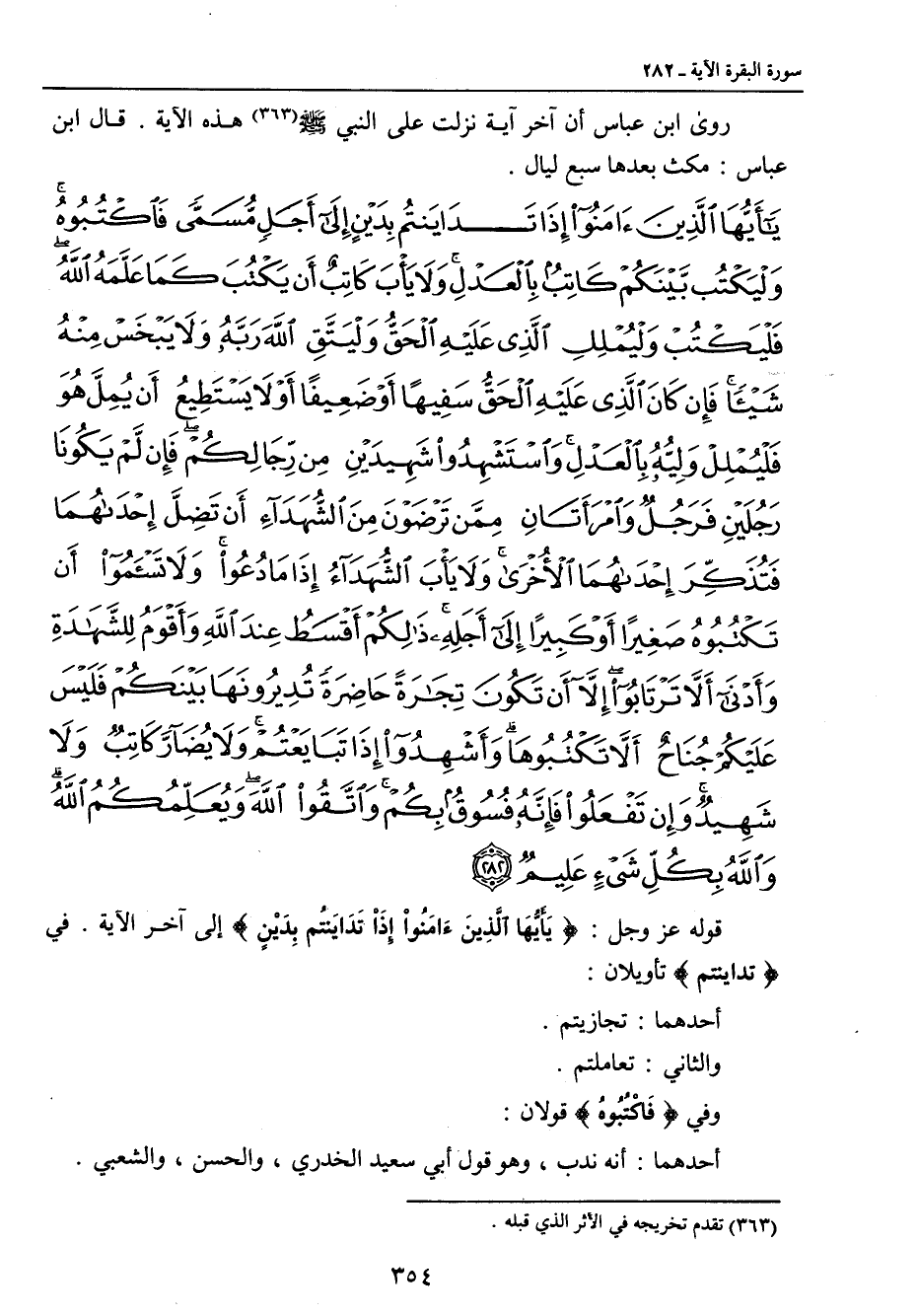 {يا أيها الذين آمنوا إذا تداينتم بدين إلى أجل مسمى فاكتبوه وليكتب بينكم كاتب بالعدل ولا يأب كاتب أن يكتب كما علمه الله فليكتب وليملل الذي عليه الحق وليتق الله ربه ولا يبخس منه شيئا فإن كان الذي عليه الحق سفيها أو ضعيفا أو لا يستطيع أن يمل هو فليملل وليه بالعدل واستشهدوا شهيدين من رجالكم فإن لم يكونا رجلين فرجل وامرأتان ممن ترضون من الشهداء أن تضل إحداهما فتذكر إحداهما الأخرى ولا يأب الشهداء إذا ما دعوا ولا تسأموا أن تكتبوه صغيرا أو كبيرا إلى أجله ذلكم أقسط عند الله وأقوم للشهادة وأدنى ألا ترتابوا إلا أن تكون تجارة حاضرة تديرونها بينكم فليس عليكم جناح ألا تكتبوها وأشهدوا إذا تبايعتم ولا يضار كاتب ولا شهيد وإن تفعلوا فإنه فسوق بكم واتقوا الله ويعلمكم الله والله بكل شيء عليم} قوله عز وجل: {يَأَيُّهَا الَّذِينَءَامَنُواْ إِذَا تَدَايَنتُم بِدَيْنٍ} إلى آخر الآية. في {تداينتم} تأويلان: أحدهما: تجازيتم. والثاني: تعاملتم. وفي {فَاكْتُبُوهُ} قولان: أحدهما: أنه ندب , وهو قول أبي سعيد الخدري , والحسن , والشعبي.
