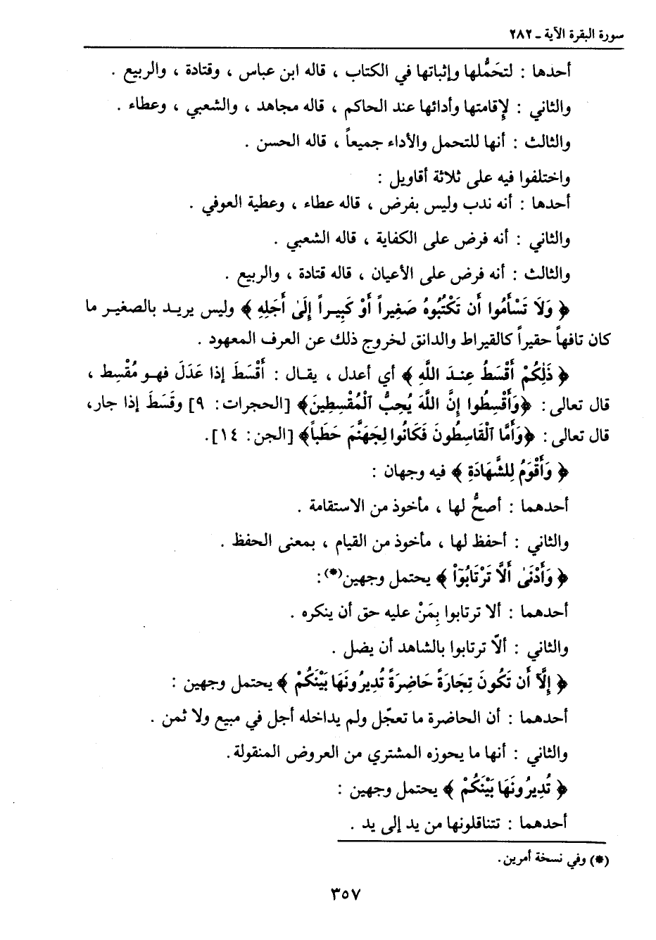 أحدها: لتحَمُّلها وإثباتها في الكتاب , قاله ابن عباس , وقتادة , والربيع. والثاني: لإِقامتها وأدائها عند الحاكم , قاله مجاهد , والشعبي , وعطاء. والثالث: أنها للتحمل والأداء جميعاً , قاله الحسن. واختلفوا فيه على ثلاثة أقاويل: أحدها: أنه ندب وليس بفرض , قاله عطاء , وعطية العوفي. والثاني: أنه فرض على الكفاية , قاله الشعبي. والثالث: أنه فرض على الأعيان , قاله قتادة , والربيع. {وَلاَ تَسْأَمُوا أَن تَكْتُبُوهُ صَغِيراً أَوْ كَبِيراً إِلَى أَجَلِهِ} وليس يريد بالصغير ما كان تافهاً حقيراً كالقيراط والدانق لخروج ذلك عن العرف المعهود. {ذلكم أقسط عند الله} أي أعدل , يقال: أَقْسَطَ إِذا عَدَلَ فهو مُقْسِط , قال تعالى: {وَأَقْسِطُوا إِنَّ اللهَ يُحِبُّ الْمُقْسِطِينَ} [الحجرات: 9] وقَسَطَ إذا جار , قال تعالى: {وَأَمَّا الْقَاسِطُونَ فَكَانوا لِجَهَنَّمَ حَطَباً} [الجن: 14]. {وَأَقْوَمُ لِلشَّهَادَةِ} فيه وجهان: أحدهما: أصحُّ لها , مأخوذ من الاستقامة. والثاني: أحفظ لها , مأخوذ من القيام , بمعنى الحفظ. {وَأَدْنَى أَلاَّ تَرْتَابُواْ} يحتمل وجهين: أحدهما: ألا ترتابوا بِمَنْ عليه حق أن ينكره. والثاني: ألاّ ترتابوا بالشاهد أن يضل. {إِلاَّ أَن تَكُونَ تِجَارَةً حَاضِرَةً تُدِيرُونَهَا بَيْنَكُمْ} يحتمل وجهين: أحدهما: أن الحاضرة ما تعجّل ولم يداخله أجل في مبيع ولا ثمن. والثاني: أنها ما يحوزه المشتري من العروض المنقولة. {تُدِيرُونَهَا بَيْنَكُمْ} يحتمل وجهين: أحدهما: تتناقلونها من يد إلى يد.