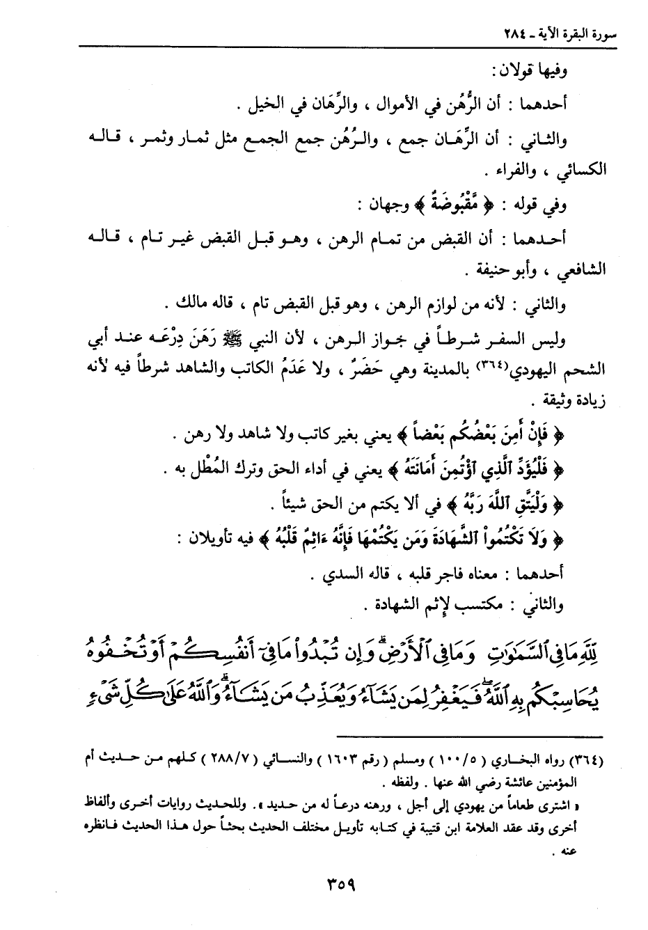 وفيها قولان: أحدهما: أن الرُّهُن في الأموال , والرِّهَان في الخيل. والثاني: أن الرِّهَان جمع , والرُهُن جمع الجمع مثل ثمار وثمر , قاله الكسائي , والفراء. وفي قوله: {مَّقْبُوضَةٌ} وجهان: أحدهما: أن القبض من تمام الرهن , وهو قبل القبض غير تام , قاله الشافعي , وأبو حنيفة. والثاني: لأنه من لوازم الرهن , وهو قبل القبض التام , قاله مالك. وليس السفر شرطاً في جواز الرهن , لأن النبي صلى الله عليه وسلم رَهَنَ دِرْعَه عند أبي الشحم اليهودي بالمدينة وهي حَضَرٌ , ولا عَدَمُ الكاتب والشاهد شرطاً فيه لأنه زيادة وثيقة. {فَإِنْ أَمِنَ بَعْضُكُم بَعْضاً} يعني بغير كاتب ولا شاهد ولا رهن. {فَلْيُؤَدِّ الَّذِي اؤْتُمِنَ أَمَانَتَهُ} يعني في أداء الحق وترك المُطْل به. {وَلْيَتَّقِ اللَّهَ رَبَّهُ} في ألا يكتم من الحق شيئاً. {وَلاَ تَكْتُمُوا الشِّهَادَةَ وَمَن يَكْتُمْهَا فَإِنَّهُءَاثِمٌ قَلْبُهُ} فيه تأويلان: أحدهما: معناه فاجر قلبه , قاله السدي. والثاني: مكتسب لإِثم الشهادة.