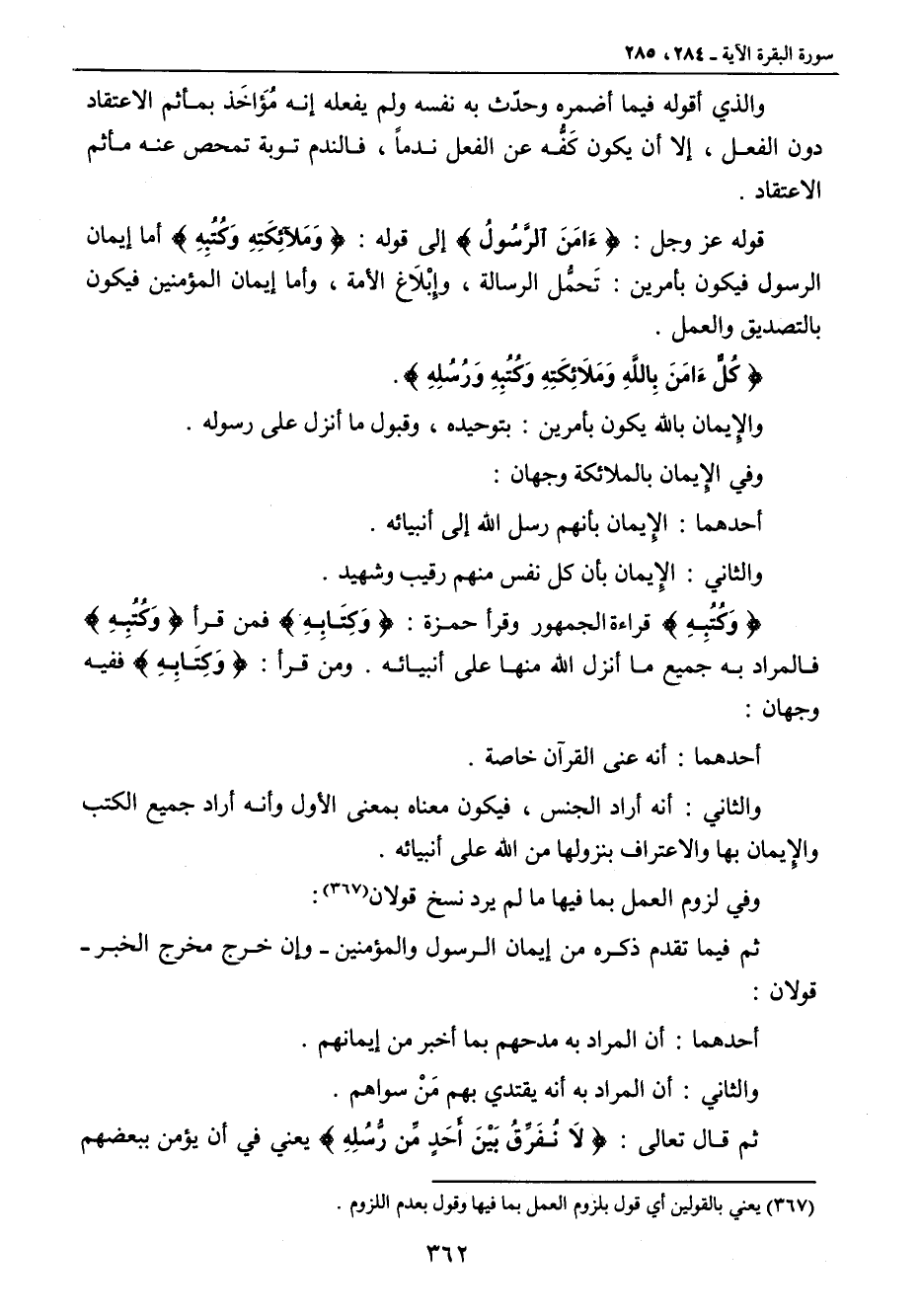 والذي أقوله فيما أضمره وحدّث به نفسه ولم يفعله إنه مُؤَاخَذ بمأثم الإعتقاد دون الفعل , إلا أن يكون كَفُّه عن الفعل ندماً , فالندم توبة تمحص عنه مأثم الإعتقاد. قوله عز وجل: {ءَامَنَ الرَّسُولُ} إلى قوله: {وَمَلآئِكَتِهِ وَكُتُبِهِ} أما إيمان الرسول فيكون بأمرين: تحمُّل الرسالة , وإِبْلاَغ الأمة , وأما إيمان المؤمنين فيكون بالتصديق والعمل. {كُلٌّءَامَنَ باللَّهِ وَمَلائِكَتِهِ وَكُتُبِهِ وَرُسُلِهِ}. والإِيمان بالله يكون بأمرين: بتوحيده , وقبول ما أنزل على رسوله. وفي الإِيمان بالملائكة وجهان: أحدهما: الإِيمان بأنهم رسل الله إلى أنبيائه. والثاني: الإِيمان بأن كل نفس منهم رقيب وشهيد. {وَكُتُبِهِ} قراءة الجمهور وقرأ حمزة: {وكِتَابِهِ} فمن قرأ {وَكُتُبِهِ} فالمراد به جميع ما أنزل الله منها على أنبيائه. ومن قرأ: {وَكِتَابِهِ} ففيه وجهان: أحدهما: أنه عنى القرآن خاصة. والثاني: أنه أراد الجنس , فيكون معناه بمعنى الأول وأنه أراد جميع الكتب والإِيمان بها والاعتراف بنزولها من الله على أنبيائه. وفي لزوم العمل بما فيها ما لم يرد نسخ قولان: ثم فيما تقدم ذكره من إيمان الرسول والمؤمنين - وإن خرج مخرج الخبر - قولان: أحدهما: أن المراد به مدحهم بما أخبر من إيمانهم. والثاني: أن المراد به أنه يقتدي بهم مَنْ سواهم. ثم قال تعالى: {لاَ نُفَرِّقُ بَيْنَ أَحَدٍ مِّن رُّسُلِهِ} يعني في أن يؤمن ببعضهم