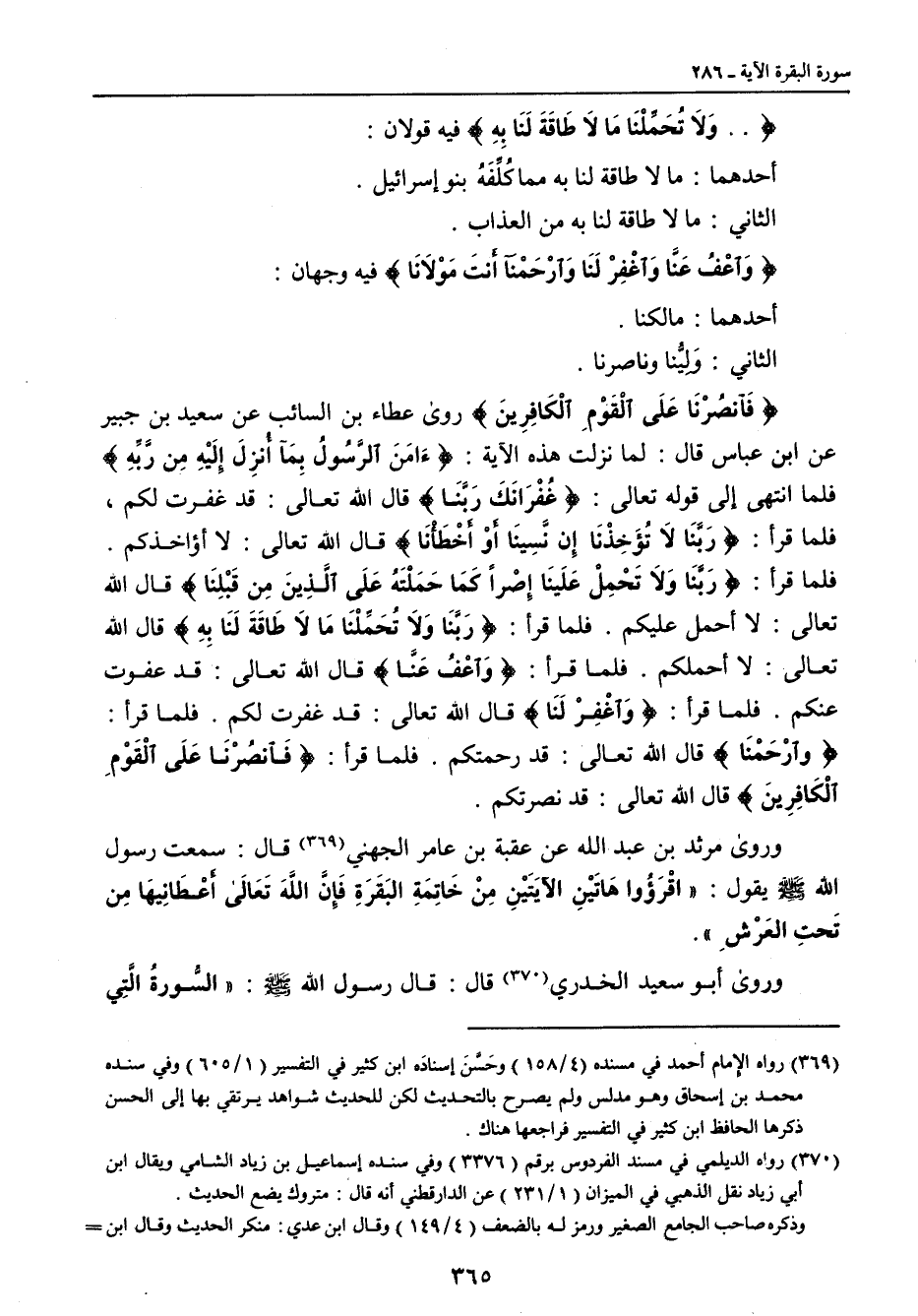 {. . ولا تحملنا ما لا طاقة لنا به} فيه قولان: أحدهما: ما لا طاقة لنا به مما كلفه بنو إسرائيل. الثاني: ما لا طاقة لنا به من العذاب. {واعف عنا واغفر لنا وارحمنا أنت مولانا} فيه وجهان: أحدهما: مالكنا. الثاني: ولينا وناصرنا. {فانصرنا على القوم الكافرين} روى عطاء بن السائب عن سعيد بن جبير عن ابن عباس قال: لما نزلت هذه الآية: {آمن الرسول بما أنزلنا إليه من ربه} فلما انتهى إلى قوله تعالى: {غفرانك ربنا} قال الله تعالى: قد غفرت لكم، فلما قرأ: {ربنا لا تؤخذنا إن نسينا أو أخطأنا} قال الله تعالى: لا أؤخذكم. فلما قرأ: {ربنا ولا تحمل علينا إصراً كما حملته على الذين من قبلنا} قال الله تعالى: لا أحمل عليكم. فلما قرأ: {ربنا ولا تحملنا ما لا طاقة لنا به} قال الله تعالى: لا أحملكم. فلما قرأ: {واعف عنا} قال الله تعالى: قد عفوت عنكم. فلما قرأ: (واغفر لنا} قال الله تعالى: قد غفرت لكم. فلما قرأ: {وارحمنا} قال الله تعالى: قد رحمتكم. فلما قرأ: {فانصرنا على القوم الكافرين} قال الله تعالى: قد نصرتكم. وروى مرثد بن عبد الله عن عقبة بن عامر الجهني قال: سمعت رسول الله صلى الله عليه وسلم يقول: " اقرؤوا هاتين الآيتين من خاتمة البقرة فإن الله تعالى أعطانيها من تحت العرش ". وروى أبو سعيد الخدري قال: قال رسول الله صلى الله عليه وسلم: السورة التي