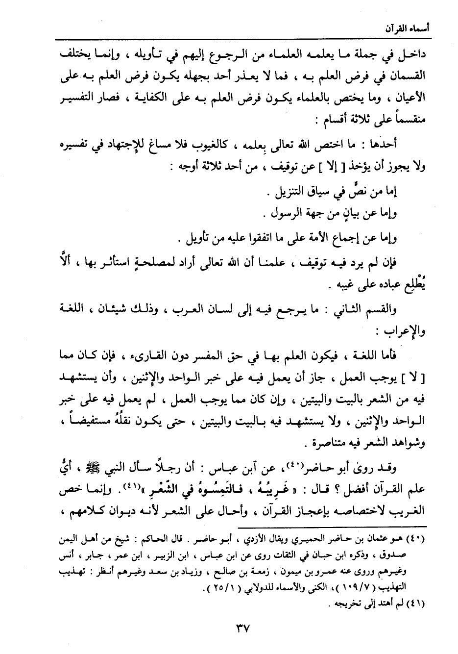 داخل في جملة ما يعلمه العلماء من الرجوع إليهم في تأويله، وإنما يختلف القسمان في فرض العلم به، فما لا يعذر أحد بجهله يكون فرض العلم به على الأعيان، وما يختص بالعلماء يكون فرض العلم به على الكفاية، فصار التفسير منقسما على ثلاثة أقسام: