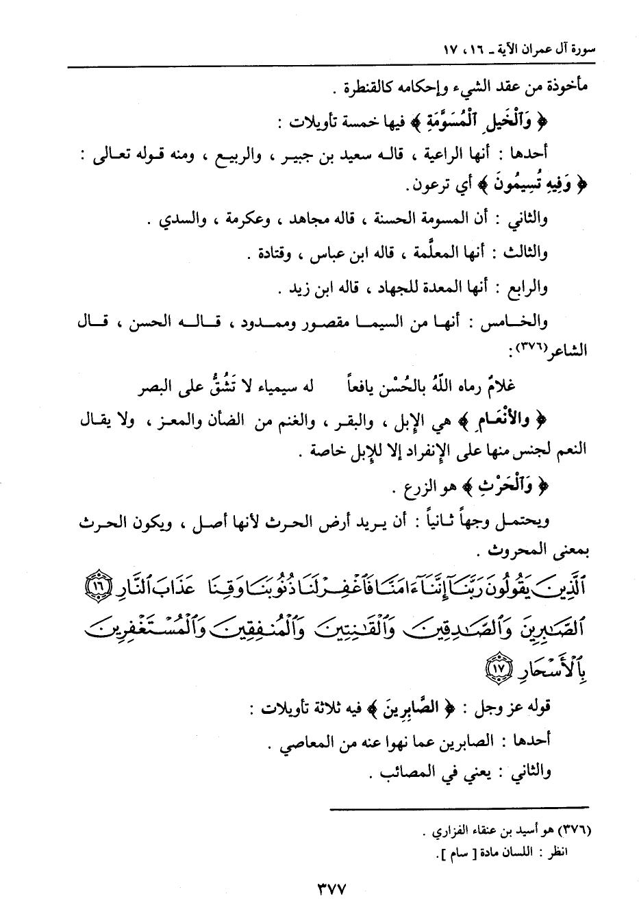 {والأنْعَامِ} هي الإِبل , والبقر , والغنم من الضأن والمعز , ولا يقال النعم لجنس منها على الإِنفراد إلا للإِبل خاصة. {والْحَرْثِ} هو الزرع. ويحتمل وجهاً ثانياً: أن يريد أرض الحرث لأنها أصل , ويكون الحرث بمعنى المحروث.
