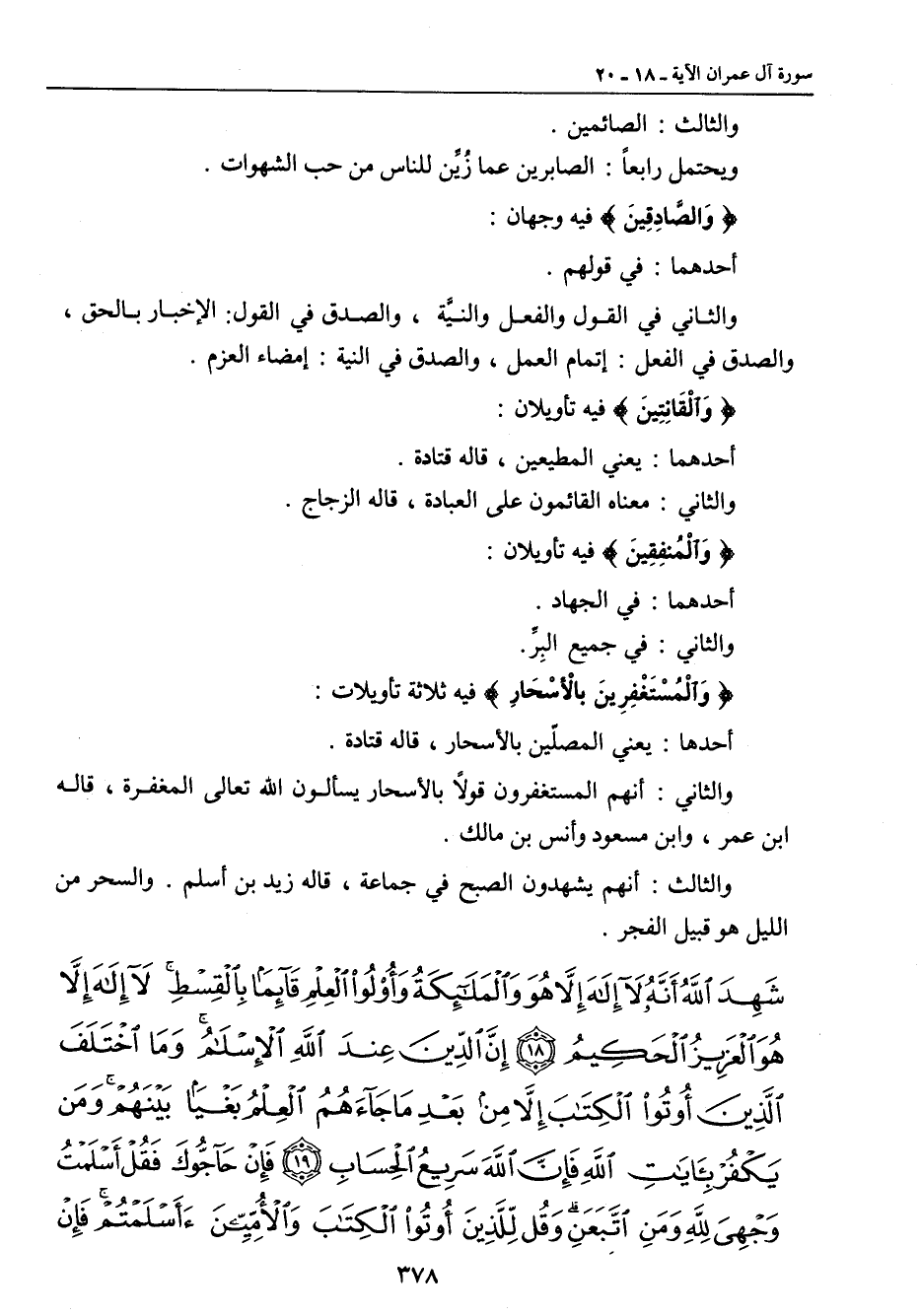 والثالث: الصائمين. ويحتمل رابعاً: الصابرين عما زُيِّن للناس من حب الشهوات. {وَالصَّادِقِينَ} فيه وجهان: أحدهما: في قولهم. والثاني في القول والفعل والنيَّة , والصدق في القول: الإخبار بالحق , والصدق في الفعل: إتمام العمل , والصدق في النية: إمضاء العزم. {وَالْقَانِتِينَ} فيه تأويلان: أحدهما: يعني المطيعين , قاله قتادة. والثاني: معناه القائمون على العبادة , قاله الزجاج. {والْمُنفِقِينَ} فيه تأويلان: أحدهما: في الجهاد. والثاني: في جميع البِرِّ. {وَالْمُسْتَغْفِرِينَ بالأْسْحَارِ} فيه ثلاثة تأويلات: أحدها يعني المصلين بالأسحار , قاله قتادة. والثاني: أنهم المستغفرون قولاً بالأسحار يسألون الله تعالى المغفرة , قاله ابن عمر , وابن مسعود وأنس بن مالك. والثالث: أنهم يشهدون الصبح في جماعة , قاله زيد بن أسلم. والسحر من الليل هو قبيل الفجر.