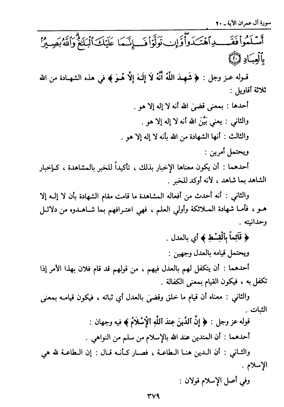 أسلموا فقد اهتدوا وإن تولوا فإنما عليك البلاغ والله بصير بالعباد} قوله عز وجل: {شَهِدَ اللَّهُ أَنَّهُ لاَ إِلَهَ إِلاَّ هُوَ} في هذه الشهادة من الله ثلاثة أقاويل: أحدها: بمعنى قضى الله أنه لا إله إلا هو. والثاني: يعني بَيَّنَ الله أنه لا إله إلا هو. والثالث: أنها الشهادة من الله بأنه لا إله إلا هو. ويحتمل أمرين: أحدهما: أن يكون معناها الإِخبار بذلك , تأكيداً للخبر بالمشاهدة , كإخبار الشاهد بما شاهد , لأنه أوكد للخبر. والثاني: أنه أحدث من أفعاله المشاهدة ما قامت مقام الشهادة بأن لا إله إلا هو , فأما شهادة الملائكة وأولي العلم , فهي اعترافهم بما شاهدوه من دلائل وحدانيته. {قَآئِماً بِالْقِسْطِ} أي بالعدل. ويحتمل قيامه بالعدل وجهين: أحدهما: أن يتكفل لهم بالعدل فيهم , من قولهم قد قام فلان بهذا الأمر إذا تكفل به , فيكون القيام بمعنى الكفالة. والثاني: معناه أن قيام ما خلق وقضى بالعدل أي ثباته , فيكون قيامه بمعنى الثبات. قوله عز وجل: {إِنَّ الدِّينَ عِندَ اللَّهِ الإِسْلاَمُ} فيه وجهان: أحدهما: أن المتدين عند الله بالإِسلام من سلم من النواهي. والثاني: أن الدين هنا الطاعة , فصار كأنه قال: إن الطاعة لله هي الإِسلام. وفي أصل الإسلام قولان: