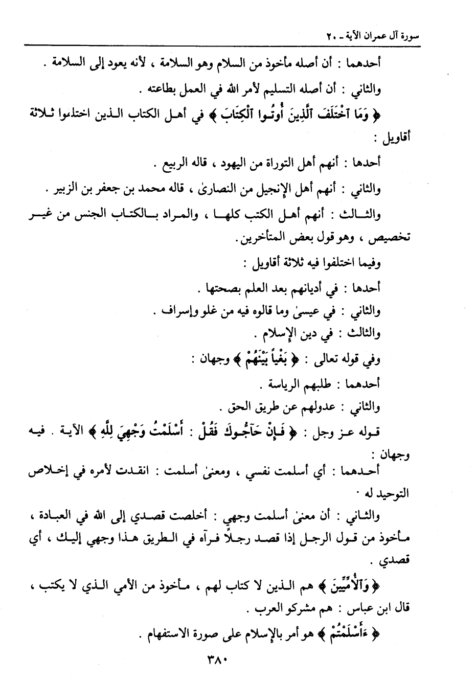 أحدهما: أن أصله مأخوذ من السلام وهو السلامة , لأنه يعود إلى السلامة. والثاني: أن أصله التسليم لأمر الله في العمل بطاعته. {وَمَا اخْتَلَفَ الَّذِينَ أُوتُوا الْكِتَابَ} في أهل الكتاب الذين اختلفوا ثلاثة أقاويل: أحدها: أنهم أهل التوراة من اليهود , قاله الربيع. والثاني: أنهم أهل الإِنجيل من النصارى , قاله محمد بن جعفر بن الزبير. والثالث: أنهم أهل الكتب كلها , والمراد بالكتاب الجنس من غير تخصيص , وهو قول بعض المتأخرين. وفيما اختلفوا فيه ثلاثة أقاويل: أحدها: في أديانهم بعد العلم بصحتها. والثاني: في عيسى وما قالوه فيه من غلو وإسراف. والثالث: في دين الإِسلام. وفي قوله تعالى: {بَغْياً بَيْنَهُمْ} وجهان: أحدهما: طلبهم الرياسة. والثاني: عدولهم عن طريق الحق. قوله عز وجل: {فَإِنْ حَآجُّوكَ فَقُلْ: أَسْلَمْتُ وَجْهِيَ لِلَّهِ} الآية. فيه وجهان: أحدهما: أي أسلمت نفسي , ومعنى أسلمت: انقدت لأمره في إخلاص التوحيد له. والثاني: أن معنى أسلمت وجهي: أخلصت قصدي إلى الله في العبادة , مأخوذ من قول الرجل إذا قصد رجلاً فرآه في الطريق هذا وجهي إليك , أي قصدي. {وَالأُمِّيِّينَ} هم الذين لا كتاب لهم , مأخوذ من الأمي الذي لا يكتب , قال ابن عباس: هم مشركو العرب. {ءَأَسْلَمْتُمْ} هو أمر بالإِسلام على صورة الاستفهام.
