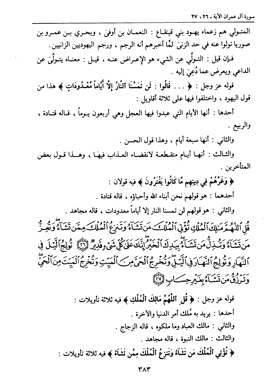 المتولي هم زعماء يهود بني قينقاع: النعمان بن أوفى , وبحري بن عمرو بن صوريا تولوا عنه في حد الزنى لما أخبرهم أنه الرجم , ورجم اليهوديين الزانيين. فإن قيل: التولِّي عن الشيء هو الإعراض عنه , قيل: معناه يتولَّى عن الداعي ويعرض عما دُعِيَ إليه. قوله عز وجل: { ... قَالُوا لَن تَمَسَّنَا النَّارُ إِلاَّ أَيَّاماً مَّعْدُودَاتٍ} هذا من قول اليهود , واختلفوا فيها على ثلاثة أقاويل: أحدها: أنها الأيام التي عبدوا فيها العجل وهي أربعون يوماً , قاله قتادة , والربيع. والثاني: أنها سبعة أيام , وهذا قول الحسن. والثالث: أنها متقطعة لانقضاء العذاب فيها , وهذا قول بعض المتأخرين. {وَغَرَّهُمْ فِي دِينِهِم مَّا كَانُوا يَفْتَرُونَ} فيه قولان: أحدهما: هو قولهم نحن أبناء الله وأحباؤه , قاله قتادة. والثاني: هو قولهم لن تمسنا النار إلا أياماً معدودات , قاله مجاهد.