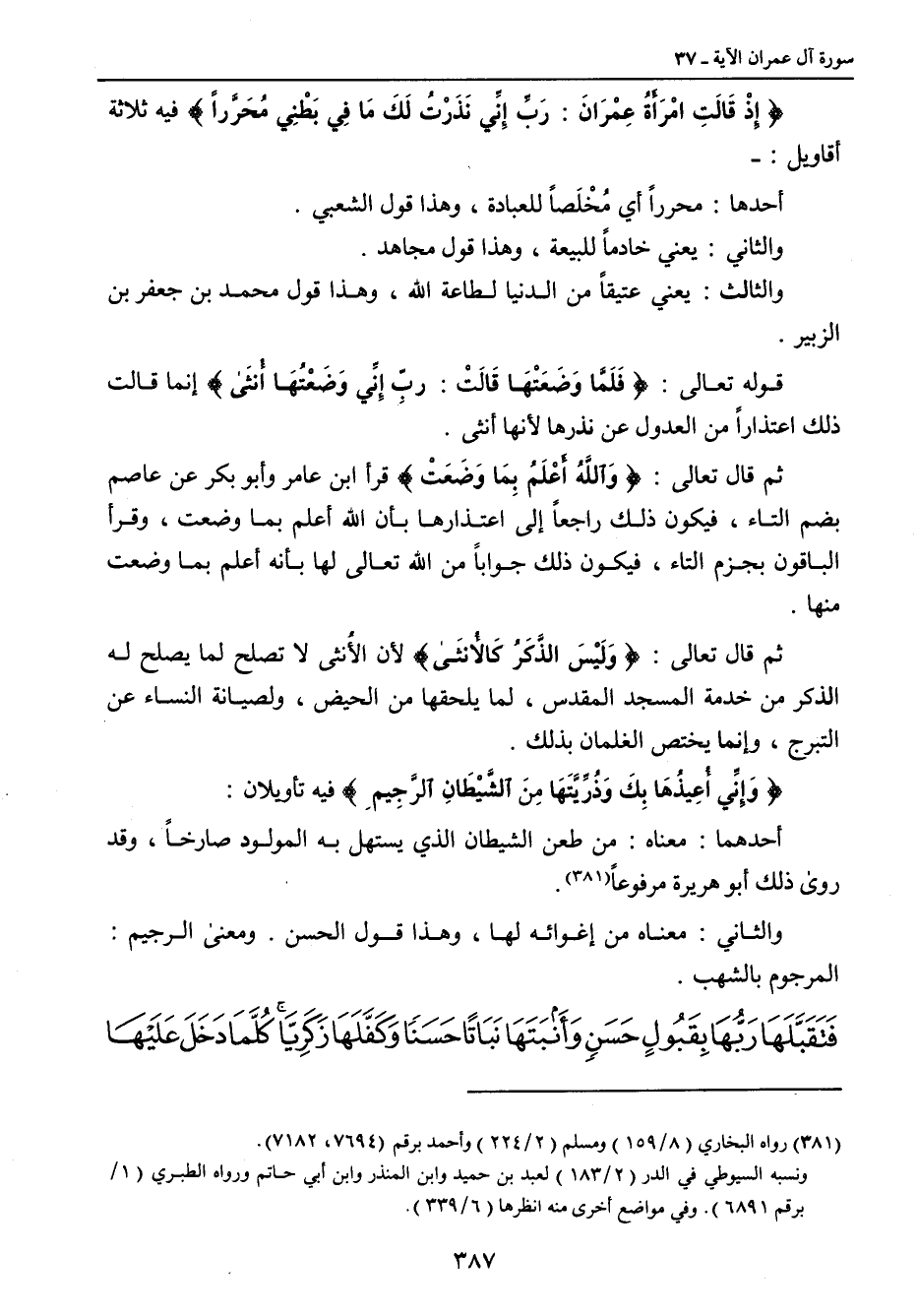 {إِذْ قَالَتِ امْرَأَةُ عِمْرَانَ: رَبِّ إِنِّي نَذَرْتُ لَكَ مَا فِي بَطْنِي مُحَرَّراً} فيه ثلاثة أقاويل: - أحدها: محرراً أي مُخْلَصاً للعبادة , وهذا قول الشعبي. والثاني: يعني خادماً للبيعة , وهذا قول مجاهد. والثالث: يعني عتيقاً من الدنيا لطاعة الله , وهذا قول محمد بن جعفر بن الزبير. قوله تعالى: {فَلَمَّا وَضَعَتْهَا قَالَتْ: ربِّ إِنِّي وَضَعْتُهَا أُنثَى} إنما قالت ذلك اعتذاراً من العدول عن نذرها لأنها أنثى. ثم قال تعالى: {وَاللهُ أَعْلَمُ بِمَا وَضَعَتْ} قرأ ابن عامر وأبو بكر عن عاصم بضم التاء , فيكون ذلك راجعاً إلى اعتذارها بأن الله أعلم بما وضعت , وقرأ الباقون بجزم التاء , فيكون ذلك جواباً من الله تعالى لها بأنه أعلم بما وضعت منها. ثم قال تعالى: {وَلَيْسَ الذَّكَرُ كَالأُنثَى} لأن الأُنثى لا تصلح لما يصلح له الذكر من خدمة المسجد المقدس , لما يلحقها من الحيض , ولصيانة النساء عن التبرج , وإنما يختص الغلمان بذلك. {وَإِنِّي أُعِيذُهَا بِكَ وَذُرِّيَّتَهَا مِنَ الشَّيْطَانِ الرَّجِيمِ} فيه تأويلان: أحدهما: معناه: من طعن الشيطان الذي يستهل به المولود صارخاً , وقد روى ذلك أبو هريرة مرفوعاً. والثاني: معناه من إغوائه لها , وهذا قول الحسن , ومعنى الرجيم المرجوم بالشهب.