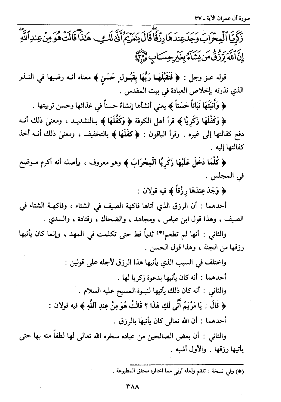 زكريا المحراب وجد عندها رزقا قال يا مريم أنى لك هذا قالت هو من عند الله إن الله يرزق من يشاء بغير حساب} قوله عز وجل: {فَتَقَبَّلَهَا رَبُّهَا بِقَبُولٍ حَسَنٍ} معناه أنه رضيها في النذر الذي نذرته بإخلاص العبادة في بيت المقدس. {وَأَنبَتَهَا نَبَاتاً حَسَناً} يعني أنشأها إنشاءً حسناً في غذائها وحسن تربيتها. {وَكَفَّلَهَا زَكَرِيَّا} قرأ أهل الكوفة {وَكَفَّلَهَا} بالتشديد , ومعنى ذلك أنه دفع كفالتها إلى غيره. وقرأ الباقون: {كفَلَهَا} بالتخفيف , ومعنى ذلك أنه أخذ كفالتها إليه. {كُلَّمَا دَخَلَ عَلَيْهَا زَكَرِيَّا الْمِحْرَابَ} وهو معروف , وأصله أنه أكرم موضع في المجلس. {وَجَدَ عِندَهَا رِزْقاً} فيه قولان: أحدهما: أن الرزق الذي أتاها فاكهة الصيف في الشتاء , وفاكهة الشتاء في الصيف , وهذا قول ابن عباس , ومجاهد , والضحاك , وقتادة , والسدي. والثاني: أنها لم تطعم ثدياً قط حتى تكلمت في المهد , وإنما كان يأتيها رزقها من الجنة , وهذا قول الحسن. واختلف في السبب الذي يأتيها هذا الرزق لأجله على قولين: أحدهما: أنه كان يأتيها بدعوة زكريا لها. والثاني: أنه كان ذلك يأتيها لنبوة المسيح عليه السلام. {قَالَ: يَا مَرْيَمُ أَنَّى لَكِ هَذَا؟ قَالَتْ هُوَ مِنْ عِندِ اللَّهِ} فيه قولان: أحدهما: أن الله تعالى كان يأتيها بالرزق. والثاني: أن بعض الصالحين من عباده سخره الله تعالى لها لطفاً منه بها حتى يأتيها رزقها. والأول أشبه.