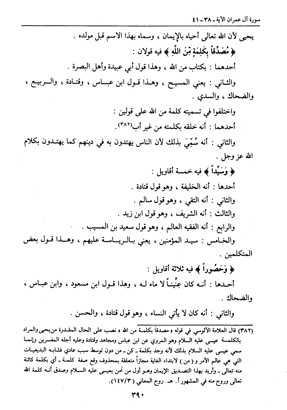 يحيى لأن الله تعالى أحياه بالإيمان , وسماه بهذا اسم قبل مولده. {مُصَدِّقاً بِكَلِمَةٍ مِّنَ اللَّهِ} فيه قولان: أحدهما: بكتاب من الله , وهذا قول أبي عبيدة وأهل البصرة. والثاني: يعني المسيح , وهذا قول ابن عباس , وقتادة , والربيع , والضحاك , والسدي. واختلفوا في تسميته كلمة من الله على قولين: أحدهما: أنه خلقه بكلمته من غير أب. والثاني: أنه سُمِيَ بذلك لأن الناس يهتدون به في دينهم كما يهتدون بكلام الله عز وجل. {وَسَيِّداً} فيه خمسة أقاويل: أحدها: أنه الخليفة , وهو قول قتادة. والثاني: أنه التقي , وهو قول سالم. والثالث: أنه الشريف , وهو قول ابن زيد. والرابع: أنه الفقيه العالم , وهو قول سعيد بن المسيب. والخامس: سيد المؤمنين , يعني بالرياسة عليهم , وهذا قول بعض المتكلمين. {وَحَصُوراً} فيه ثلاثة أقاويل: أحدها: أنه كان عِنَّيناً لا ماء له , وهذا قول ابن مسعود , وابن عباس , والضحاك. والثاني: أنه كان لا يأتي النساء , وهو قول قتادة , والحسن.