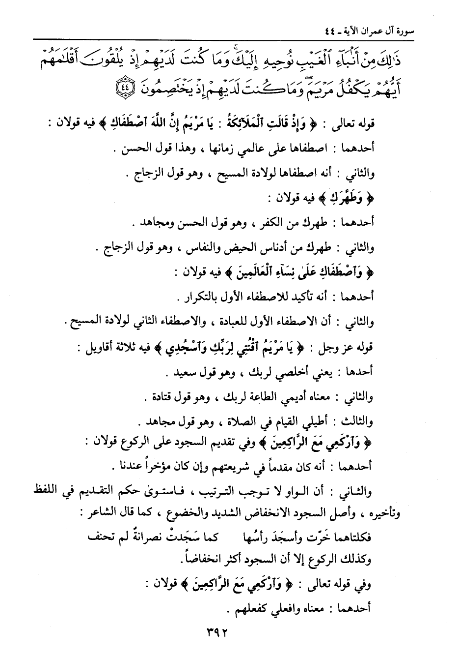 ذلك من أنباء الغيب نوحيه إليك وما كنت لديهم إذ يلقون أقلامهم أيهم يكفل مريم وما كنت لديهم إذ يختصمون} قوله تعالى: {وَإِذْ قَالَتِ الْمَلآئِكَةُ: يَا مَرْيَمُ إِنَّ اللَّهَ اصطفاك} فيه قولان: أحدهما: اصطفاها على عالمي زمانها , وهذا قول الحسن. والثاني: أنه اصطفاها لولادة المسيح , وهو قول الزجاج. {وَطَهَّرَكِ} فيه قولان: أحدهما: طهرك من الكفر , وهو قول الحسن ومجاهد. والثاني: طهرك من أدناس الحيض والنفاس , وهو قول الزجاج. {وَاصْطَفَاكِ عَلَى نِسَآءِ الْعَالَمِينَ} فيه قولان: أحدهما: انه تأكيد للاصطفاء الأول بالتكرار. والثاني: أن الاصطفاء الأول للعبادة , والاصطفاء الثاني لولادة المسيح. قوله عز وجل: {يَا مَرْيَمُ اقْنُتِي لِرَبِّكِ وَاسْجُدِي} فيه ثلاثة أقاويل: أحدها: يعني أخلصي لربك , وهو قول سعيد. والثاني: معناه أديمي الطاعة لربك , وهو قول قتادة. والثالث: أطيلي القيام في الصلاة , وهو قول مجاهد. {وَارْكَعِي مَعَ الرَّاكِعِينَ} وفي تقديم السجود على الركوع قولان: أحدهما: أنه كان مقدماً في شريعتهم وإن كان مؤخراً عندنا. والثاني: أن الواو لا توجب الترتيب , فاستوى حكم التقديم في اللفظ وتأخيره , وأصل السجود والانخفاض الشديد والخضوع , كما قال الشاعر: