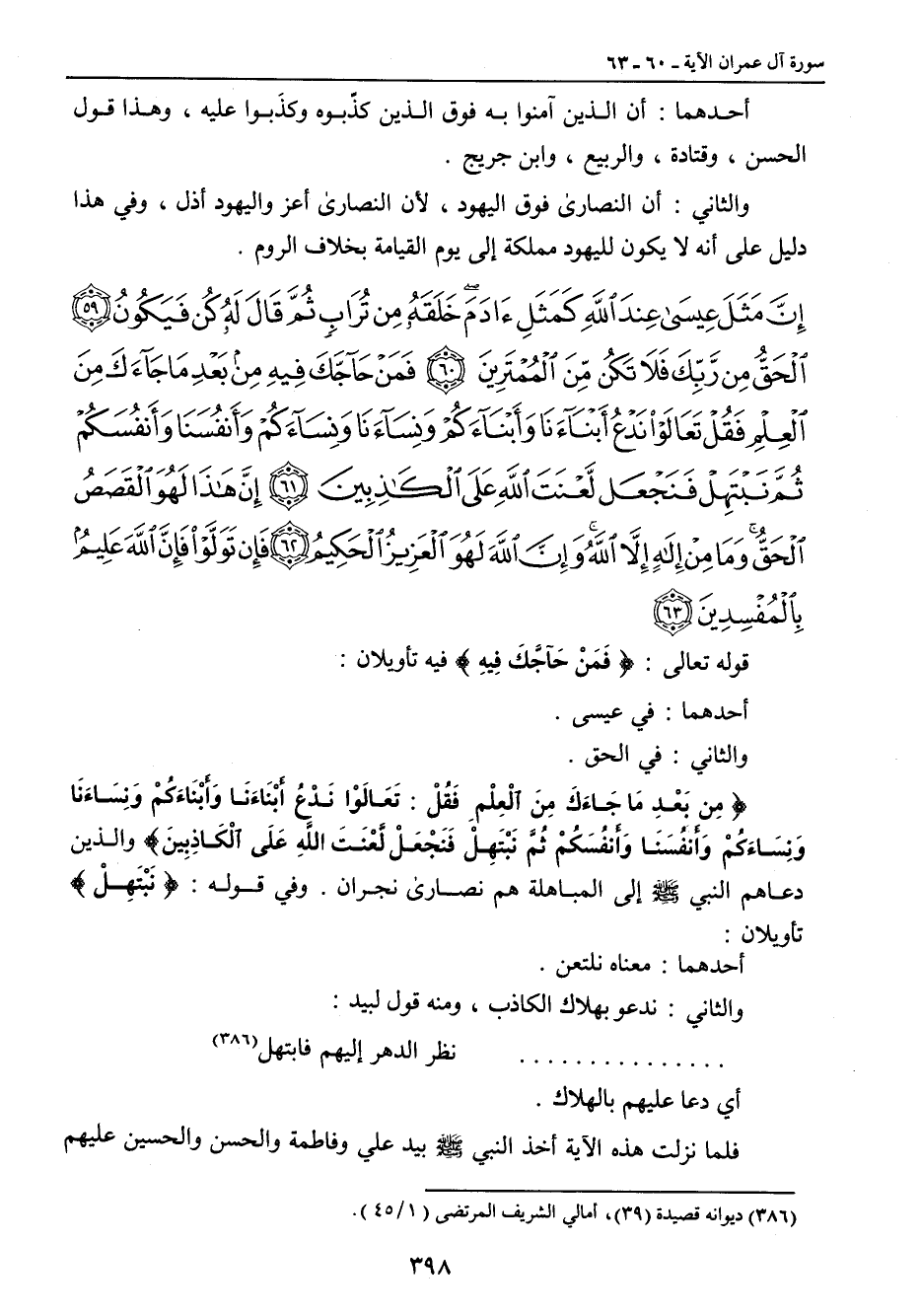{إن مثل عيسى عند الله كمثل آدم خلقه من تراب ثم قال له كن فيكون الحق من ربك فلا تكن من الممترين فمن حاجك فيه من بعد ما جاءك من العلم فقل تعالوا ندع أبناءنا وأبناءكم ونساءنا ونساءكم وأنفسنا وأنفسكم ثم نبتهل فنجعل لعنة الله على الكاذبين إن هذا لهو القصص الحق وما من إله إلا الله وإن الله لهو العزيز الحكيم فإن تولوا فإن الله عليم بالمفسدين} قوله تعالى: {فَمَنْ حَآجَّكَ فِيهِ} فيه تأويلان: أحدهما: في عيسى. والثاني: في الحق. {مِن بَعْدِ مَا جَاءَكَ مِنَ الْعِلْمِ فَقُلْ: تَعَالَوْا نَدْعُ أَبْنَاءَنَا وأَبْنَاءَكُمْ وَنِسَاءَنَا وَنِسَاءَكُمْ وَأَنفُسَنَا وَأَنفُسَكُمْ ثُمَّ نَبْتَهِلْ فَنَجْعَلْ لَّعْنَتَ اللَّهِ عَلَى الْكَاذِبِينَ} والذين دعاهم النبي صلى الله عليه وسلم إلى المباهلة هم نصارى نجران. وفي قوله: {نَبْتَهِلْ} تأويلان: أحدهما: معناه نلتعن. والثاني: ندعو بهلاك الكاذب , ومنه قول لبيد: