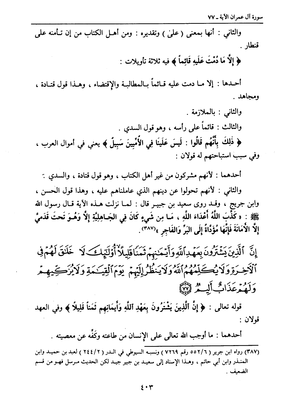 والثاني: أنها بمعنى (على) وتقديره: ومن أهل الكتاب من إن تأمنه على قنطار. {إِلاَّ مَا دُمْتَ عَلَيهِ قَائِماً} فيه ثلاثة تأويلات: أحدها: إلا ما دمت عليه قائماً بالمطالبة والإقتضاء , وهذا قول قتادة , ومجاهد. والثاني. بالملازمة. والثالث: قائماً على رأسه , وهو قول السدي. {ذَلِكَ بِأَنَّهُم قَالُوا: لَيسَ عَلَينَا فِي الأُمِّيِينَ سَبِيلٌ} يعني في أموال العرب , وفي سبب استباحتهم له قولان: أحدهما: لأنهم مشركون من غير أهل الكتاب , وهو قول قتادة , والسدي. والثاني: لأنهم تحولوا عن دينهم الذي عاملناهم عليه , وهذا قول الحسن وابن جريج , وقد روى سعيد بن جبير قال: لما نزلت هذه الآية قال رسول الله صلى الله عليه وسلم: (كَذَّبَ اللهُ أَعْدَاءَ اللهِ , مَا مِن شَيءٍ كَانَ في الجَاهِليَّةِ إلاَّ وَهُوَ تَحتَ قَدَميَّ إلاَّ الأمَانَةَ فَإنَّها مُؤَدَّاةٌ إِلَى الَبرِّ وَالفَاجِرِ).