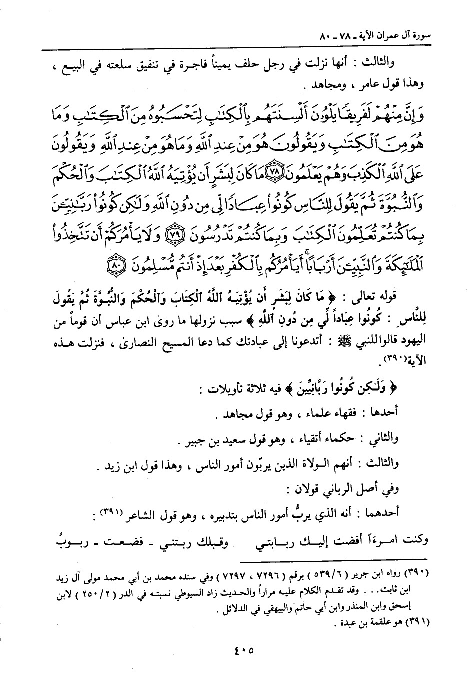 {وإن منهم لفريقا يلوون ألسنتهم بالكتاب لتحسبوه من الكتاب وما هو من الكتاب ويقولون هو من عند الله وما هو من عند الله ويقولون على الله الكذب وهم يعلمون ما كان لبشر أن يؤتيه الله الكتاب والحكم والنبوة ثم يقول للناس كونوا عبادا لي من دون الله ولكن كونوا ربانيين بما كنتم تعلمون الكتاب وبما كنتم تدرسون ولا يأمركم أن تتخذوا الملائكة والنبيين أربابا أيأمركم بالكفر بعد إذ أنتم مسلمون} قوله تعالى: {مَا كَانَ لِبَشَرٍ أَن يُؤْتِيَهُ اللَّهُ الْكِتَابَ وَالْحُكْمَ وَالنُّبُوَّةَ ثُمَّ يَقُولَ لِلنَّاسِ: كُونُوا عِبَاداً لِّي مِن دُونِ اللَّهِ} سبب نزولها ما روى ابن عباس أن قوماً من اليهود قالوا للنبي صلى الله عليه وسلم: أتدعونا إلى عبادتك كما دعا المسيح النصارى , فنزلت هذه الآية. {وَلَكِن كُونُوا رَبَّانِيِّينَ} فيه ثلاثة تأويلات: أحدها: فقهاء علماء , وهو قول مجاهد. والثاني: حكماء أتقياء , وهو قول سعيد بن جبير. والثالث: أنهم الولاة الذين يربّون أمور الناس , وهذا قول ابن زيد. وفي أصل الرباني قولان: أحدها: أنه الذي يربُّ أمور الناس بتدبيره , وهو قول الشاعر: