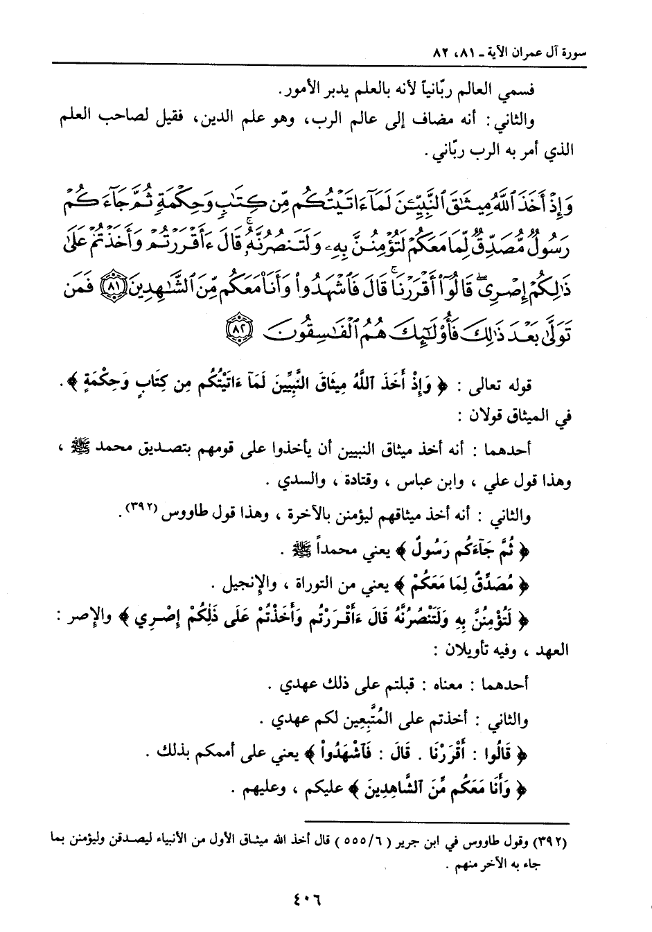 {وإذ أخذ الله ميثاق النبيين لما آتيتكم من كتاب وحكمة ثم جاءكم رسول مصدق لما معكم لتؤمنن به ولتنصرنه قال أأقررتم وأخذتم على ذلكم إصري قالوا أقررنا قال فاشهدوا وأنا معكم من الشاهدين فمن تولى بعد ذلك فأولئك هم الفاسقون} قوله تعالى: {وَإِذْ أَخَذَ اللَّهُ مِيثَاقَ النَّبِيِّينَ لَمَآءَاتَيْتُكُم مِن كِتَابٍ وَحِكْمَةٍ} في الميثاق قولان: أحدهما: أنه أخذ ميثاق النبيين أن يأخذوا على قومهم بتصديق محمد صلى الله عليه وسلم , وهذا قول علي , وابن عباس , وقتادة , والسدي. والثاني: أنه أخذ ميثاقهم ليؤمنن بالآخرة , وهذا قول طاووس. {ثُمَّ جَآءَكُم رَسُولٌ} يعني محمداً صلى الله عليه وسلم. {مُصَدِّقٌ لِمَا مَعَكُمْ} يعني من التوارة , والإنجيل. {لَتُؤْمِنُنَّ بِهِ وَلَتَنْصُرُنَّهُ قَالَءَأَقْرَرْتُم وَأَخَذْتُمْ عَلَى ذَلِكُمْ إِصْرِي} والإصر: العهد , وفيه تأويلان: أحدهما: معناه: قبلتم على ذلك عهدي. والثاني: أخذتم على المُتَّبِعِين لكم عهدي. {قَالُوا: أَقْرَرْنَا. قَالَ: فَاشْهَدُواْ} يعني على أممكم بذلك. {وَأَنَا مَعَكُم مِّنَ الشَّاهِدِينَ} عليكم , وعليهم.