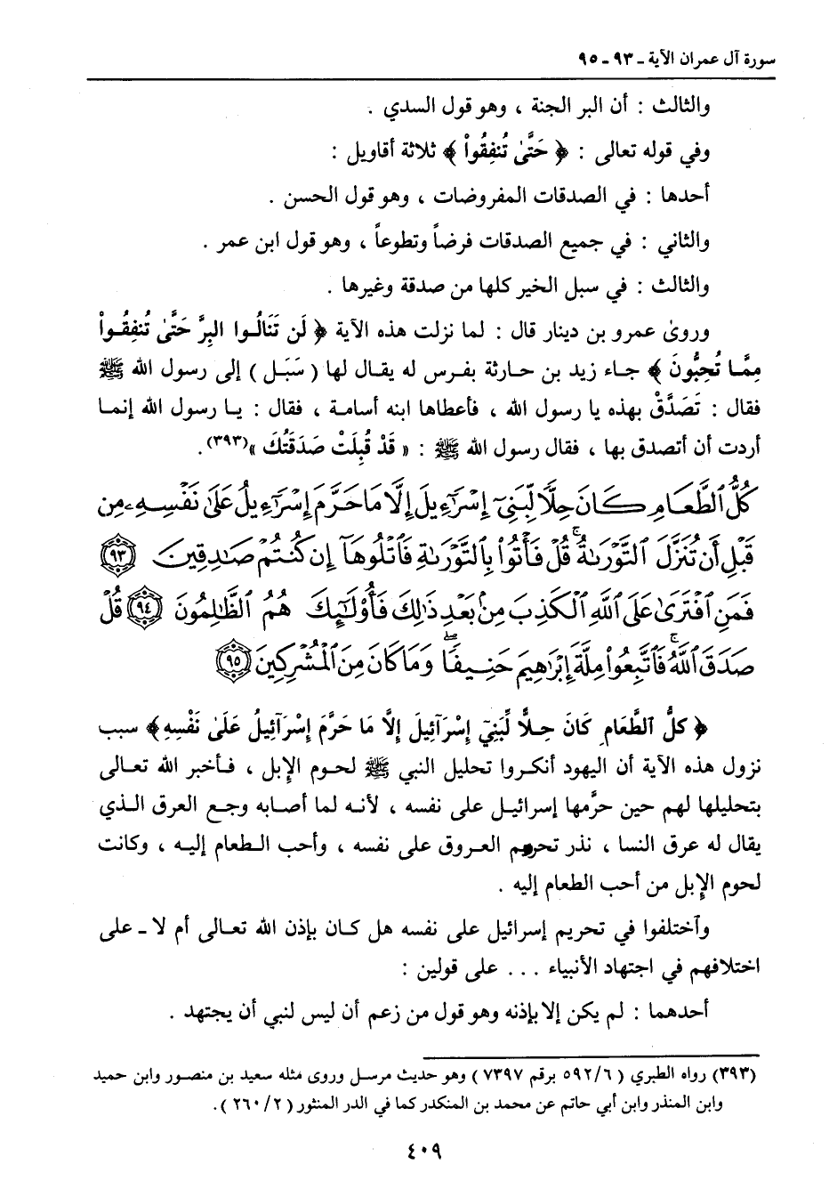 {كل الطعام كان حلا لبني إسرائيل إلا ما حرم إسرائيل على نفسه من قبل أن تنزل التوراة قل فأتوا بالتوراة فاتلوها إن كنتم صادقين فمن افترى على الله الكذب من بعد ذلك فأولئك هم الظالمون قل صدق الله فاتبعوا ملة إبراهيم حنيفا وما كان من المشركين} {كلُّ الطَّعَامِ كَانَ حِلاًّ لِّبَنِي إِسْرَآئِيلَ إِلاَّ مَا حَرَّمَ إِسْرَآئِيلُ عَلَى نَفْسِهِ} سبب نزول هذه الآية أن اليهود أنكروا تحليل النبي صلى الله عليه وسلم لحوم الإبل , فأخبر الله تعالى بتحليلها لهم حين حرَّمها إسرائيل على نفسه , لأنه لما أصابه وجع العرق الذي يقال له عرق النسا , نذر تحريم العروق على نفسه , وأحب الطعام إليه , وكانت لحوم الإبل من أحب الطعام إليه. واختلفوا في تحريم إسرائيل على نفسه هل كان بإذن الله تعالى أم لا _ على اختلافهم في اجتهاد الأنبياء على قولين: أحدهما: لم يكن إلا بإذنه وهو قول من زعم أن ليس لنبي أن يجتهد.