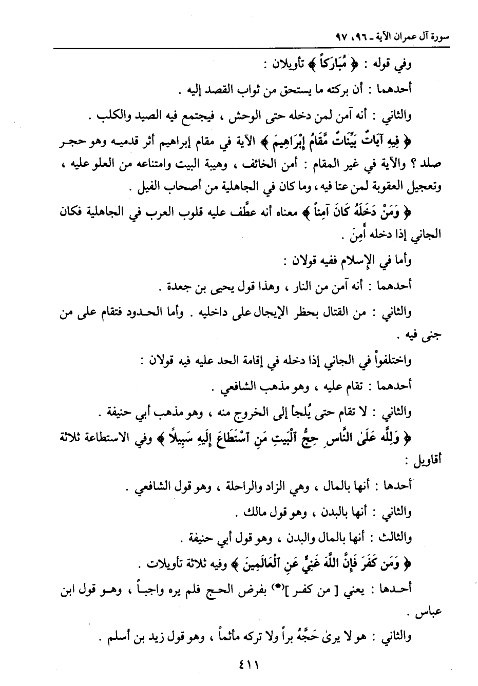 وفي قوله: {مُبَارَكاً} تأويلان: أحدهما: أن بركته ما يستحق من ثواب القصد إليه. والثاني: أنه آمن لمن دخله حتى الوحش , فيجتمع فيه الصيد والكلب. {فِيهِ آيَاتٌ بَيِّنَاتٌ مَّقَامُ إِبْرَاهِيمَ} الآية في مقام إبراهيم أثر قدميه وهو حجر صلد؟ والآية في غير المقام: أمن الخائف , وهيبة البيت وامتناعه من العلو عليه , وتعجيل العقوبة لمن عتا فيه , وما كان في الجاهلية من أصحاب الفيل. {وَمَنْ دَخَلَهُ كَانَ آمِناً} معناه أنه عطَّف عليه قلوب العرب في الجاهلية فكان الجاني إذا دخله أمِنَ. وأما في الإسلام ففيه قولان: أحدهما: أنه من النار , وهذا قول يحيى بن جعدة. والثاني: من القتال بحظر الإيجال على داخليه , وأما الحدود فتقام على من جنى فيه. واختلفواْ في الجاني إذ دخله في إقامة الحد عليه فيه قولان: أحدهما: تقام عليه , وهو مذهب الشافعي. والثاني: لا تقاوم حتى يُلجأ إلى الخروج منه , وهو مذهب أبي حنيفة. {وَللَّهِ عَلَى النَّاسِ حِجُّ الْبَيتِ مَنِ اسْتَطَاعَ إِلَيهِ سَبِيلاً} وفي الاستطاعة ثلاثة أقاويل: أحدها: أنها بالمال , وهي الزاد والراحلة , وهو قول الشافعي. والثاني: أنها بالبدن , وهو قول مالك. والثالث: أنها بالمال والبدن , وهو قول أبي حنيفة. {وَمَن كَفَرَ فَإِنَّ اللَّهَ غَنِيٌّ عَنِ الْعَالَمِينَ} وفيه ثلاثة تأويلات: أحدها: يعني [من كفر] بفرض الحج فلم يره واجباً , وهو قول ابن عباس. والثاني: هو لا يرى حَجَّهُ براً ولا تركه مأثماً , وهو قول زيد بن أسلم.
