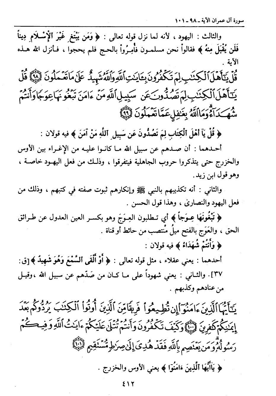 {قل يا أهل الكتاب لم تكفرون بآيات الله والله شهيد على ما تعملون قل يا أهل الكتاب لم تصدون عن سبيل الله من آمن تبغونها عوجا وأنتم شهداء وما الله بغافل عما تعملون} {قُلْ يَا أهْلَ الْكِتَابِ لِمَ تَصُدُّونَ عَن سَبِيلِ اللَّهِ مَنْ آمَنَ} فيه قولان: أحدهما: أن صدهم عن سبيل ما كانوا عليه من الإغراء بين الأوس والخزرج حتى يتذكروا حروب الجاهلية فيتفرقوا , وذلك من فعل اليهود خاصة , وهو قول ابن زيد. والثاني: أنه تكذيبهم بالنبي صلى الله عليه وسلم وإنكارهم ثبوت صفته في كتبهم , وذلك من فعل اليهود والنصارى , وهذا قول الحسن. {تَبْغُونَهَا عِوَجاً} أي تطلبون العِوَجَ وهو بكسر العين العدول عن طرائق الحق , والعَوَج بالفتح ميلُ منتصب من حائط أو قناة. {وَأَنتُمْ شُهَدَاءُ} فيه قولان: أحدهما: يعني عقلاء , مثل قوله تعالى: {أَوْ أَلْقَى السَّمْعَ وَهُوَ شَهِيدٌ} [ق: 37]. والثاني: يعني شهوداً على ما كان من صَدّهم عن سبيل الله , وقيل من عنادهم وكذبهم.
