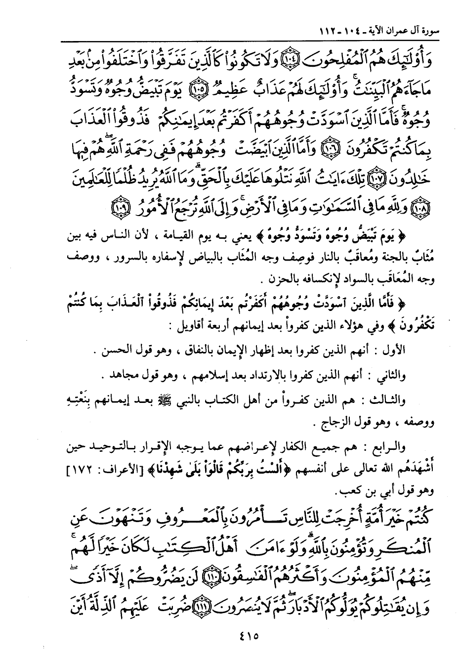 وأولئك هم المفلحون ولا تكونوا كالذين تفرقوا واختلفوا من بعد ما جاءهم البينات وأولئك لهم عذاب عظيم يوم تبيض وجوه وتسود وجوه فأما الذين اسودت وجوههم أكفرتم بعد إيمانكم فذوقوا العذاب بما كنتم تكفرون وأما الذين ابيضت وجوههم ففي رحمة الله هم فيها خالدون تلك آيات الله نتلوها عليك بالحق وما الله يريد ظلما للعالمين ولله ما في السماوات وما في الأرض وإلى الله ترجع الأمور} {يَومَ تَبْيَضُّ وُجُوهٌ وَتَسْوَدُّ وُجُوهٌ} يعني به يوم القيامة , لأن الناس فيه بين مُثَابٌ بالجنة ومُعاقَبٌ بالنار فوصِف وجه المُثَاب بالبياض لإسفاره بالسرور , ووصف وجه المُعَاقَب بالسواد لإنكسافه بالحزن. {فَأَمَّا الَّذِينَ اسْوَدَّتْ وُجُوهُهُمْ أَكَفَرْتُم بَعْدَ إِيمَانِكُمْ فَذُوقُواْ الْعَذَابَ بِمَا كُنتُم تَكْفُرُونَ} وفي هؤلاء الذين كفروا بعد إيمانهم أربعة أقاويل: الأول: أنهم الذين كفرواْ بعد إظهار الإيمان بالنفاق , وهو قول الحسن. والثاني: أنهم الذين كفروا بالارتداد بعد إسلامهم , وهو قول مجاهد. والثالث: هم الذين كفروا من أهل الكتاب بالنبي صلى الله عليه وسلم بعد إيمانهم بِنَعْتِهِ ووصفه , وهو قول الزجاج. والرابع: هم جميع الكفار لإعراضهم عما يوجبه الإقرار بالتوحيد حين أَشْهَدَهُم الله تعالى على أنفسهم {أَلسْتُ بِرَبِّكُمْ قَالُواْ بَلَى شَهِدْنَا} [الأعراف: 172] وهو قول أبي بن كعب.