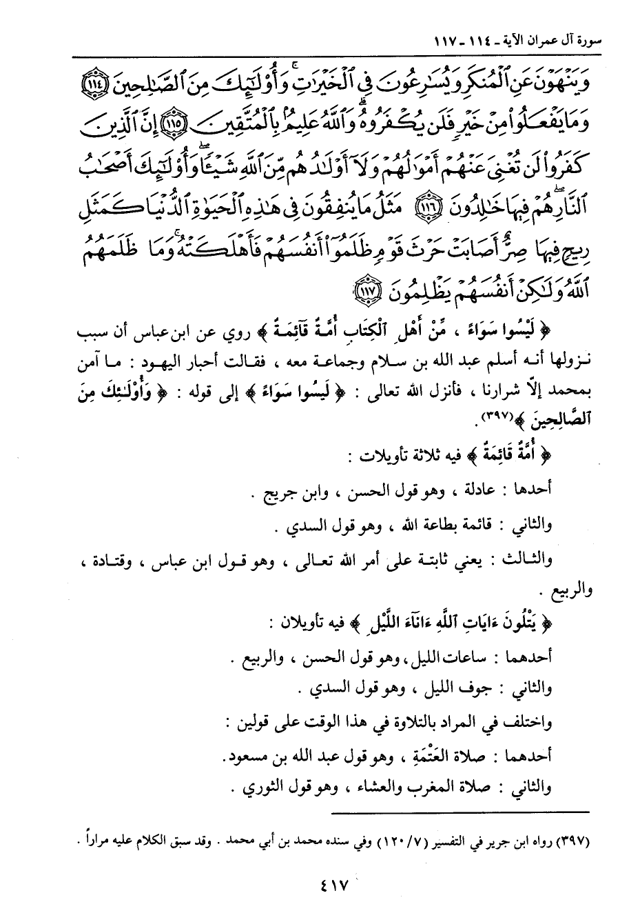 وينهون عن المنكر ويسارعون في الخيرات وأولئك من الصالحين وما يفعلوا من خير فلن يكفروه والله عليم بالمتقين إن الذين كفروا لن تغني عنهم أموالهم ولا أولادهم من الله شيئا وأولئك أصحاب النار هم فيها خالدون مثل ما ينفقون في هذه الحياة الدنيا كمثل ريح فيها صر أصابت حرث قوم ظلموا أنفسهم فأهلكته وما ظلمهم الله ولكن أنفسهم يظلمون} {لَيْسُوا سَوَاءً , مِّنْ أَهْلِ الْكِتَابِ أُمَةٌ قَآئِمَةٌ} روي عن ابن عباس أن سبب نزولها أنه أسلم عبد الله ابن سلام وجماعة معه , فقالت أحبار اليهود: ما آمن بمحمد إلاّ شرارنا , فأنزل الله تعالى: {لَيسُوا سَوَاءً} إلى قوله: {وأولئك مِنَ الصَّالِحِينَ}. {أمةٌ قَائِمَةٌ} فيه ثلاث تأويلات: أحدها: عادلة , وهو قول الحسن , وابن جريج. والثاني: قائمة بطاعة الله , وهو قول السدي. والثالث: يعني ثابتة على أمر الله تعالى , وهو قول ابن عباس , وقتادة , والربيع. {يَتْلُونَءَايَاتِ اللهِءَانآءَ اللَّيْلِ} فيه تأويلان: أحدهما: ساعات الليل , وهو قول الحسن , والربيع. والثاني: جوف الليل , وهو قول السدي. واختلف في المراد بالتلاوة في هذا الوقت على قولين: أحدهما: صلاة العَتْمَة , وهو قول عبد الله بن مسعود. والثاني: صلاة المغرب والعشاء , وهو قول الثوري.