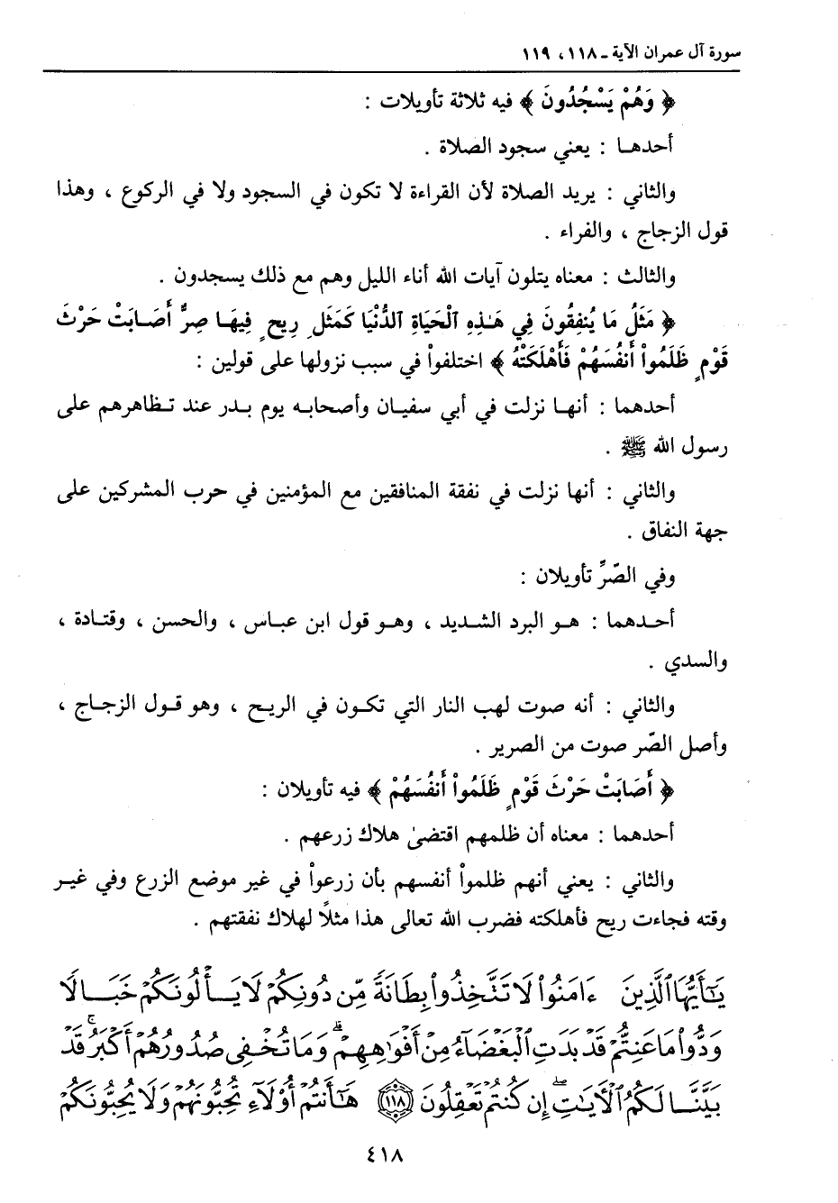 {وَهُمْ يَسْجُدُونَ} فيه ثلاثة تأويلات: أحدها: يعني سجود الصلاة. والثاني: يريد الصلاة لأن القراءة لا تكون في السجود ولا في الركوع , وهذا قول الزجاج , والفراء. والثالث: معناه يتلون آيات الله أناء الليل وهم مع ذلك يسجدون. {مَثَلُ مَا يُنفِقُونَ فِي هَذِهِ الحَيَاةِ الدُّنْيَا كَمَثَلِ رِيحٍ فِيهَا صِرٌّ أَصَابَتْ حَرْثَ قَوْمٍ ظَلَمُواْ أَنفُسَهُمْ فَأَهْلَكَتْهُ} اختلفواْ في سبب نزولها على قولين: أحدهما: أنها نزلت في أبي سفيان وأصحابه يوم بدر عند تظاهرهم على رسول الله صلى الله عليه وسلم. والثاني: أنه نزلت في نفقة المنافقين مع المؤمنين في حرب المشركين على جهة النفاق. وفي الصّرِّ تأويلان: أحدهما: هو البرد الشديد , وهو قول ابن عباس , والحسن , وقتادة , والسدي. والثاني: أنه صوت لهب النار التي تكون في الريح , وهو قول الزجاج , وأصل الصّر صوت من الصرير. {أَصَابَتْ حَرْثَ قَوْمٍ ظَلَمُواْ أَنفُسَهُمْ} فيه تأويلان: أحدهما: معناه أن ظلمهم اقتضى هلاك زرعهم. والثاني: يعني أنهم ظلموا أنفسهم بأن زرعواْ في غير موضع الزرع وفي غير وقته فجاءت ريح فأهلكته فضرب الله تعالى هذا مثلاً لهلاك نفقتهم.