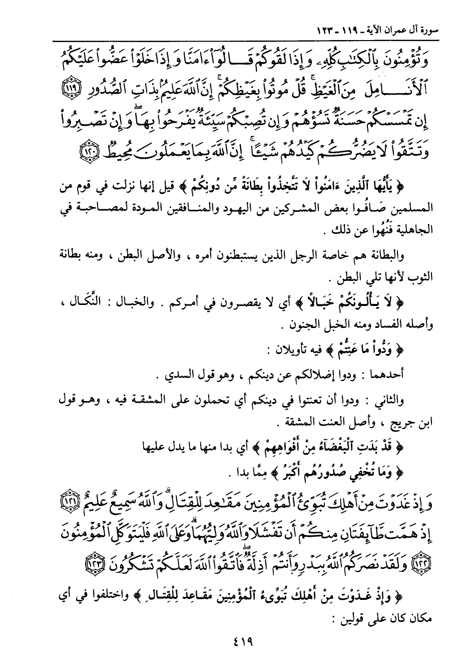 وتؤمنون بالكتاب كله وإذا لقوكم قالوا آمنا وإذا خلوا عضوا عليكم الأنامل من الغيظ قل موتوا بغيظكم إن الله عليم بذات الصدور إن تمسسكم حسنة تسؤهم وإن تصبكم سيئة يفرحوا بها وإن تصبروا وتتقوا لا يضركم كيدهم شيئا إن الله بما يعملون محيط} {يَاأَيُّهَا الَّذِينَءَامَنُوا لاَ تَتَّخِذُواْ بِطَانَةً مِّن دُونِكُمْ} قيل إنها نزلت في قوم من المسلمين صافوا بعض المشركين من اليهود والمنافقين المودة لمصاحبة في الجاهلية فَنُهُوا عن ذلك. والبطانة هم خاصة الرجل الذين يستبطنون أمره , والأصل البطن , ومنه بطانة الثوب لأنها تلي البطن. {لاَ يِأْلُونَكُمْ خَبَالاً} أي لا يقصرون في أمركم. والخبال: النَّكال , وأصله الفساد ومنه الخبل الجنون. {وَدُّواْ مَا عَنِتُّمْ} فيه تأويلان: أحدهما: ودوا إضلالكم عن دينكم , وهو قول السدي. والثاني: ودوا أن تعنتوا في دينكم أي تحملون على المشقة فيه , وهو قول ابن جريج , وأصل العنت المشقة. {قَدْ بَدَتِ الْبَغْضَآءُ مِنْ أَفْوَاهِهِمْ} أي بدا منها ما يدل عليها. {وَمَا تُخْفِي صُدُورُهُم أَكْبَرُ} مما بدا.