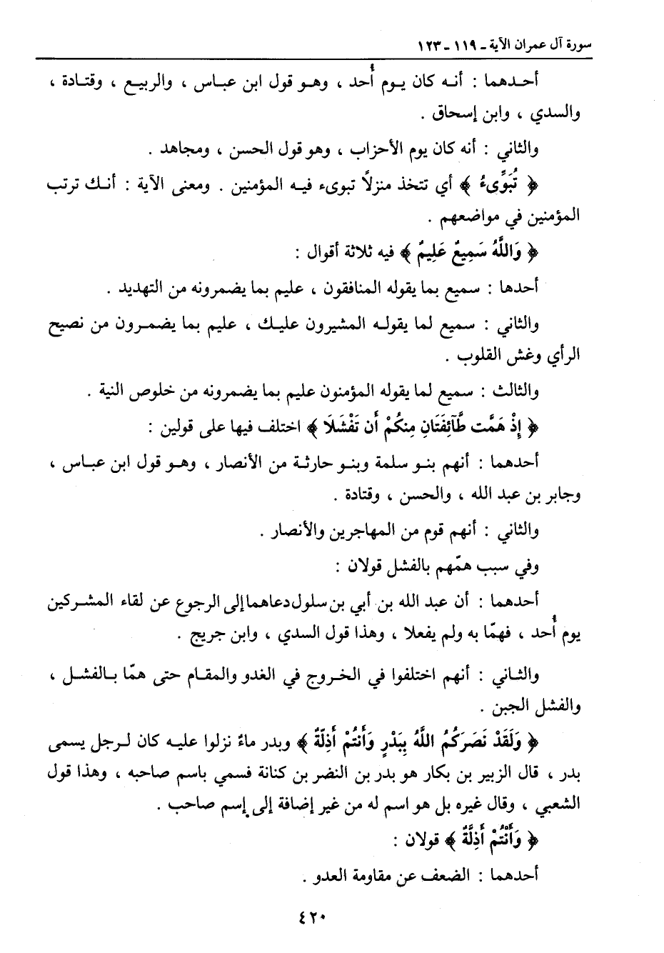 أحدهما: أنه كان يوم أُحد , وهو قول ابن عباس , والربيع , وقتادة , والسدي , وابن اسحاق. والثاني: أنه كان يوم الأحزاب , وهو قول الحسن , ومجاهد. {تُبَوِّىءُ} أي تتخد منزلاً تبوىء فيه المؤمنين. ومعنى الآية: أنك ترتب المؤمنين في مواضعهم. {وَاللهُ سَمِيعٌ عَلِيمٌ} فيه ثلاثة أقوال: أحدها: سميع بما يقوله المنافقون , عليم بما يضمرونه من التهديد. والثاني: سميع لما يقوله المشيرون عليك , عليم بما يضمرون من نصيح الرأي وغش القلوب. والثالث: سميع لما يقوله المؤمنون عليم بما يضمرون من خلوص النية. {إِذْ هَمَّت طَّآئِفَتَانِ مِنْكُمْ أَن تَفْشَلاَ} اختلف فيها على قولين: أحدهما: أنهم بنو سلمة وبنو حارثة من الأنصار , وهو قول ابن عباس , وجابر بن عبد الله , الحسن , وقتادة. والثاني: أنهم قوم من المهاجرين والأنصار. وفي سبب همّهم بالفشل قولان: أحدهما: أن عبد الله بن أبي سلول دعاهما إلى الرجوع عن لقاء المشركين يوم أحد , فهمّا به ولم يفعلا , وهذا قول السدي وابن جريج. والثاني: أنهم اختلفوا في الخروج في الغدو والمقام حتى همّا بالفشل , والفشل الجبن. {وَلَقَدْ نَصَرَكُمُ اللهُ بِبَدْرٍ وَأَنتُمْ أَذِلّةٌ} وبدر ماءٌ نزلوا عليه كان لرجل يسمى بدر , قال الزبير بن بكار هو بدر بن النضر بن كنانة فسمي باسم صاحبه , وهذا قول الشعبي , وقال غيره بل هو اسم له من غير إضافة إلى اسم صاحب. {وَأَنْتُمْ أَذِلَّةٌ} قولان: أحدهما: الضعف عن مقاومة العدو.