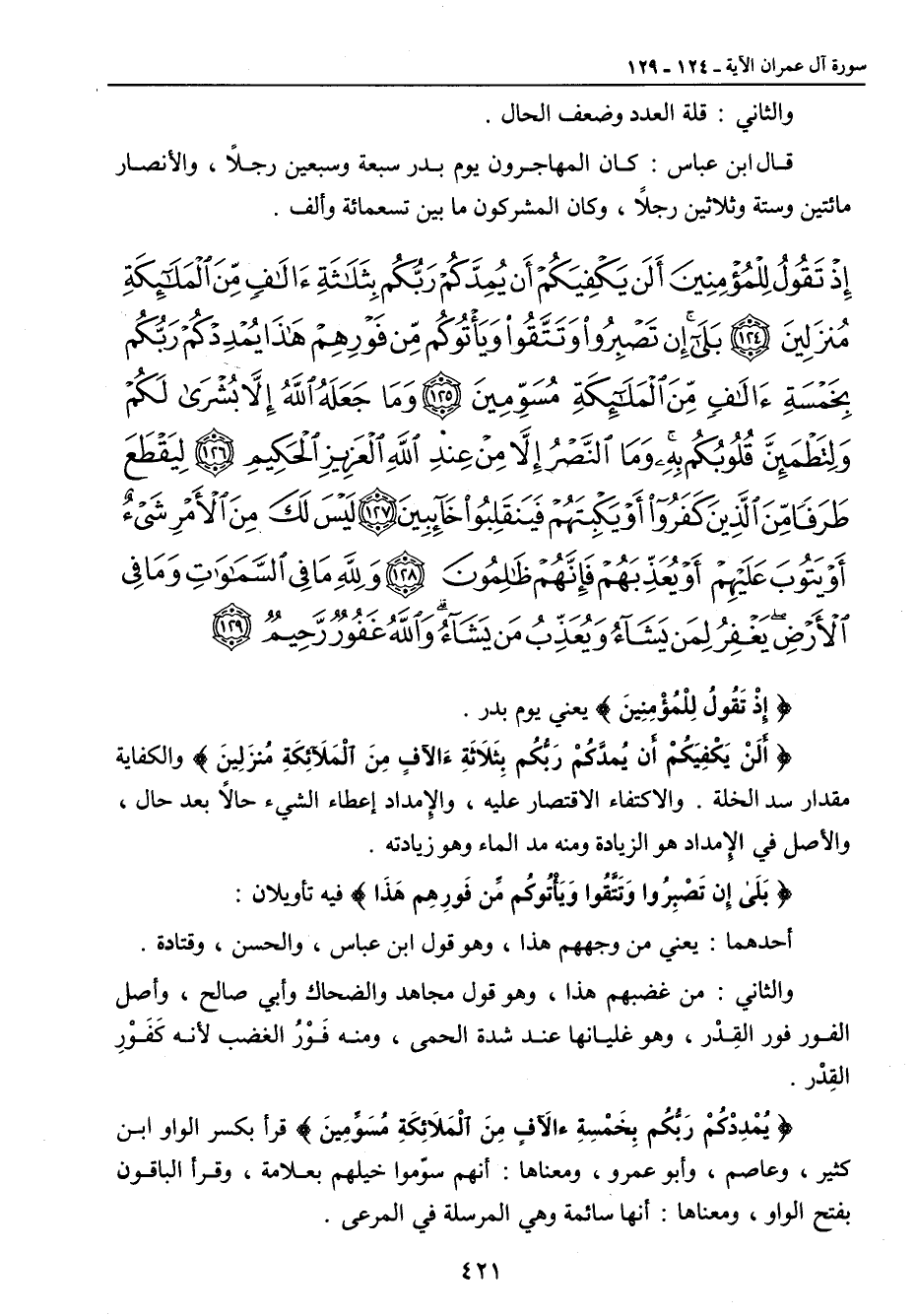 {إذ تقول للمؤمنين ألن يكفيكم أن يمدكم ربكم بثلاثة آلاف من الملائكة منزلين بلى إن تصبروا وتتقوا ويأتوكم من فورهم هذا يمددكم ربكم بخمسة آلاف من الملائكة مسومين وما جعله الله إلا بشرى لكم ولتطمئن قلوبكم به وما النصر إلا من عند الله العزيز الحكيم ليقطع طرفا من الذين كفروا أو يكبتهم فينقلبوا خائبين ليس لك من الأمر شيء أو يتوب عليهم أو يعذبهم فإنهم ظالمون ولله ما في السماوات وما في الأرض يغفر لمن يشاء ويعذب من يشاء والله غفور رحيم} {إِذْ تَقُولُ لِلْمُؤْمِنِينَ} يعني يوم بدر. {أَلَنْ يَكْفِيَكُمْ أَن يُمدَّكُمْ رَبُّكُم بِثَلاَثَةِءَالآفٍ مِنَ الْمَلآَئِكَةِ مُنزَلِينَ} والكفاية مقدار سد الخلة , والاكتفاء الاقتصار عليه , والإمداد إعطاء الشيء حالاً بعد حال , والأصل في الإمداد هو الزيادة ومنه مد الماء وهو زيادته. {بَلَى إِن تَصْبِرُوا وَتَتَّقُوا وَيِأْتُوكُم مِّن فَورِهِم هَذَا} فيه تأويلان: أحدهما: يعني من وجههم هذا , وهو قول ابن عباس , والحسن , وقتادة. والثاني: من غضبهم هذا , وهو قول مجاهد والضحاك وأبي صالح , وأصل الفور فور القِدْر , وهو غليانها عند شدة الحمى , ومنه فَوْرُ الغضب لأنه كَفَوْرِ القِدْر. {يُمْدِدْكُمْ رَبُّكُم بِخَمْسِةِ ءالآفٍ مِنَ الْمَلاَئِكَةِ مُسَوِّمِينَ} قرأ بكسر الواو ابن كثير , وعاصم , وأبو عمرو , ومعناها: أنهم سوّموا خليهم بعلامة , وقرأ الباقون بفتح الواو , ومعناها: أنها سائمة وهي المرسلة في المرعى.