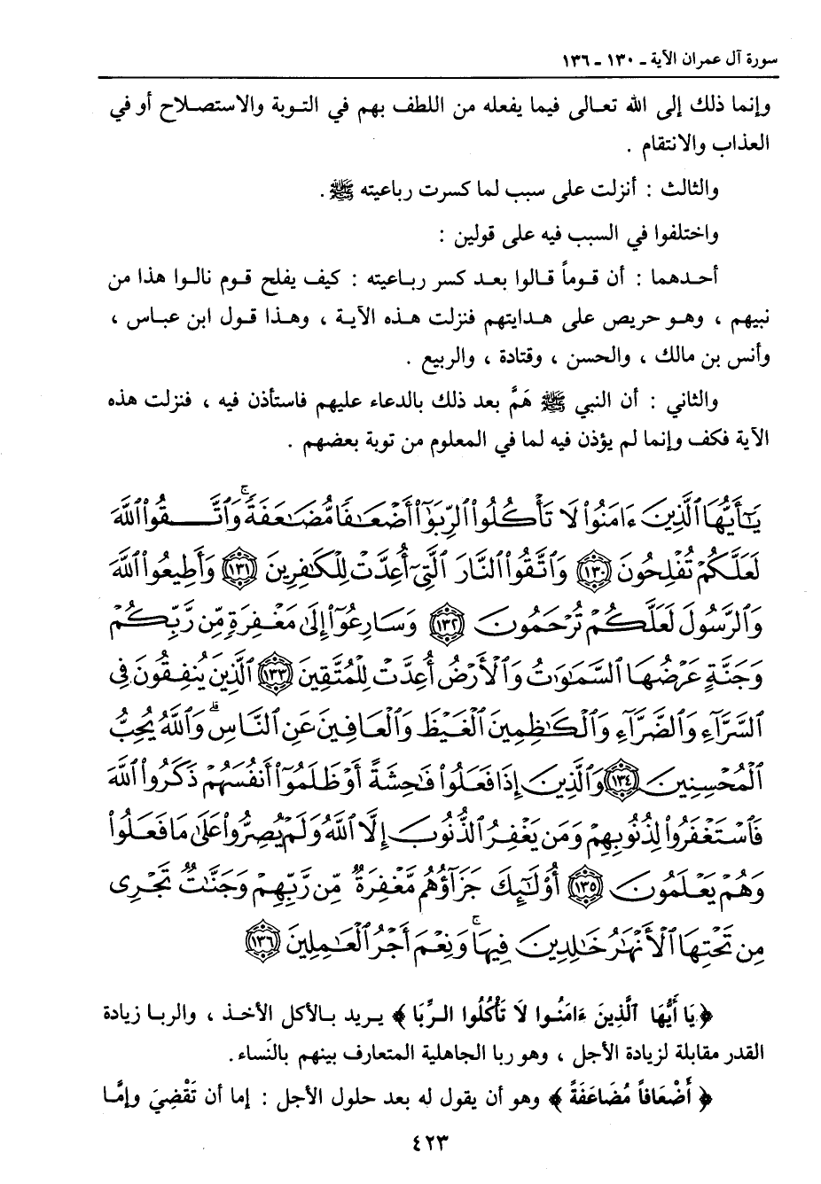 {يا أيها الذين آمنوا لا تأكلوا الربا أضعافا مضاعفة واتقوا الله لعلكم تفلحون واتقوا النار التي أعدت للكافرين وأطيعوا الله والرسول لعلكم ترحمون وسارعوا إلى مغفرة من ربكم وجنة عرضها السماوات والأرض أعدت للمتقين الذين ينفقون في السراء والضراء والكاظمين الغيظ والعافين عن الناس والله يحب المحسنين والذين إذا فعلوا فاحشة أو ظلموا أنفسهم ذكروا الله فاستغفروا لذنوبهم ومن يغفر الذنوب إلا الله ولم يصروا على ما فعلوا وهم يعلمون أولئك جزاؤهم مغفرة من ربهم وجنات تجري من تحتها الأنهار خالدين فيها ونعم أجر العاملين} {يَا أَيُّهَا الَّذِينَءَامَنُوا لاَ تَأْكُلُوا الرِّبَا} يريد بالأكل الأخذ , والربا زيادة القدر مقابلة لزيادة الأجل , وهو ربا الجاهلية المتعارف بينهم بالنساء. {أَضْعَافاً مُضَاعَفَةً} وهو أن يقول له بعد حلول الأجل: إما أن تَقْضِيَ وإمَّا