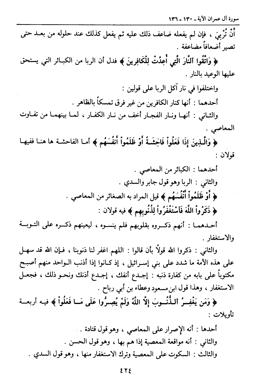 أَنْ تُرْبِيَ , فإن لم يفعله ضاعف ذلك عليه ثم يفعل كذلك عند حلوله من بعد حتى تصير أضعافاً مضاعفة. {وَاتَّقُوا النَّارَ الَّتِي أُعِدَّتْ لِلْكَافِرينَ} فدل أن الربا من الكبائر التي يستحق عليها الوعيد بالنار. واختلفوا في نار آكل الربا على قولين: أحدهما: أنها كنار الكافرين من غير فرق تمسكاً بالظاهر. والثاني: أنها ونار الفجار أخف من نار الكفار , لما بينهما من تفاوت المعاصي. {وَالَّذِينَ إِذَا فَعَلُواْ فَاحِشَةً أَوْ ظَلَمُواْ أَنفُسَهُم} أما الفاحشة ها هنا ففيها قولان: أحدهما: الكبائر من المعاصي. والثاني: الربا وهو قول جابر والسدي. {أَوْ ظَلَمُواْ أَنْفُسَهُم} قيل المراد به الصغائر من المعاصي. {ذَكَرُواْ اللهَ فَاسْتَغْفَرُواْ لِذُنُوبِهِم} فيه قولان: أحدهما: أنهم ذكروه بقلوبهم فلم ينسوه , ليعينهم ذكره على التوبة والاستغفار. والثاني: ذكروا الله قولاً بأن قالوا: اللهم اغفر لنا ذنوبنا , فإن الله قد سهل على هذه الأمة ما شدد على بني إسرائيل , إذ كانوا إذا أذنب الواحد منهم أصبح مكتوباً على بابه من كفارة ذنبه: إجدع أنفك , إجدع أذنك ونحو ذلك , فجعل الاستغفار , وهذا قول ابن مسعود وعطاء بن أبي رباح. {وَمَن يَغْفِرُ الذُّنُوبَ إِلاَّ اللهُ وَلَمْ يُصِرُّوا عَلَى مَا فَعَلُواْ} فيه أربعة تأويلات: أحدها: أنه الإصرار على المعاصي , وهو قول قتادة. والثاني: أنه مواقعة المعصية إذا هم بها , وهو قول الحسن. والثالث: السكوت على المعصية وترك الاستغفار منها , وهو قول السدي.