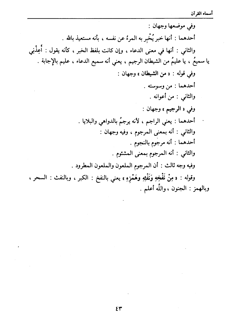 والثاني: أنها في معنى الدعاء، وإن كانت بلفظ الخبر، كأنه يقول: أعذني يا سميع، يا عليم من الشيطان الرجيم، يعنى أنه سميع الدعاء، عليم بالإجابة.