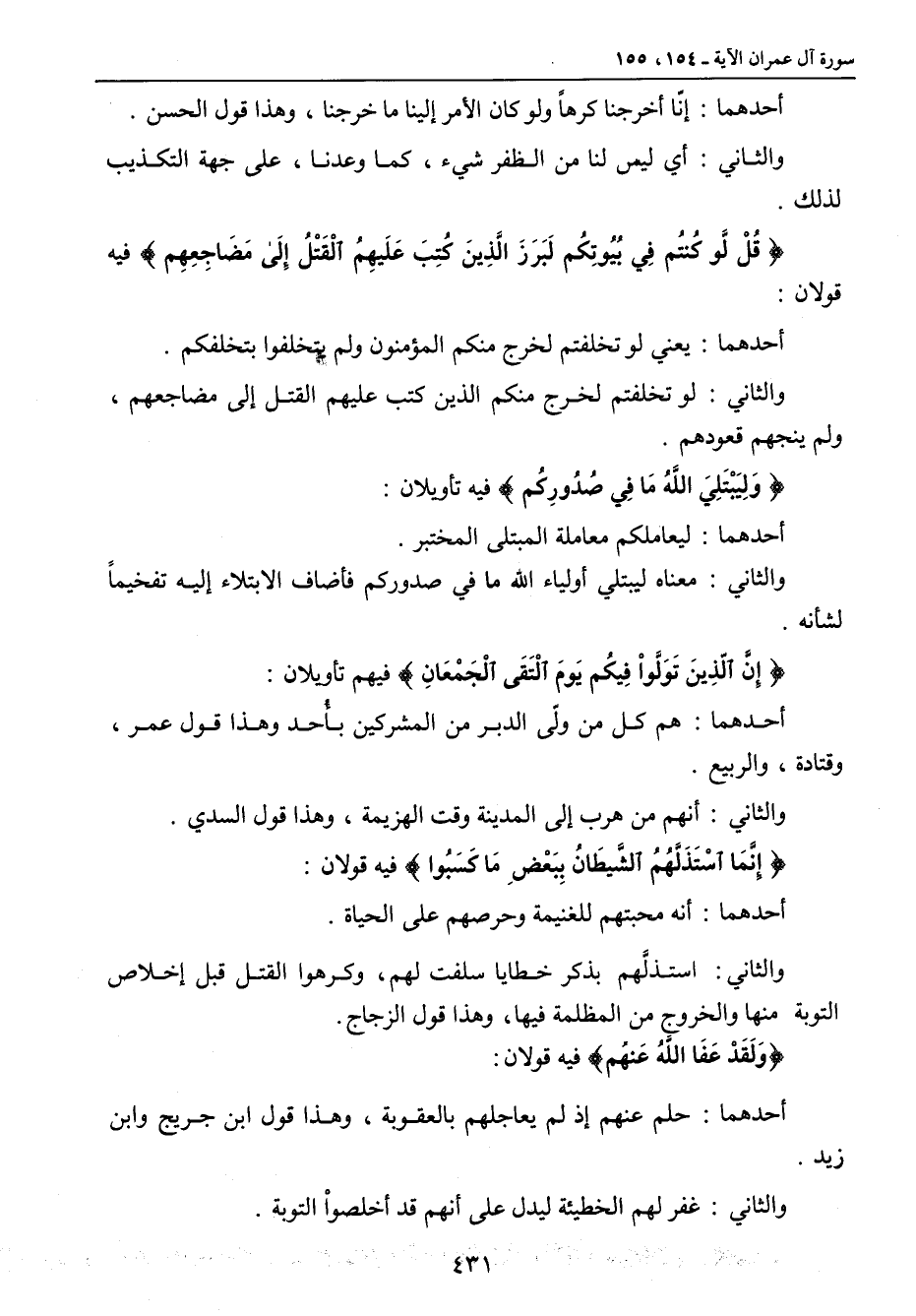 أحدهما: أناّ أخرجنا كرهاً ولو كان الأمر إلينا ما خرجنا , وهذا قول الحسن. والثاني: أي ليس لنا من الظفر شيء , كما وعدنا , على جهة التكذيب لذلك. {قُلْ لَّو كُنتُم فِي بُيُوتِكُم لَبَرَزَ الَّذِينَ كُتِبَ عَلَيهِمُ الْقَتْلُ إِلَى مَضَاجِعِهِم} فيه قولان: أحدهما: يعني لو تخلفتم لخرج منكم المؤمنون ولم يتخلفوا بتخلفكم. والثاني: لو تخلفتم لخرج منكم الذين كتب عليهم القتل إلى مضاجعهم , ولم ينجهم قعودهم. {وَلِيَبْتَلِيَ اللهُ مَا فِي صُدُورِكُم} فيه تأويلان: أحدهما: ليعاملكم معاملة المبتلى المختبر. والثاني: معناه ليبتلي أولياء الله ما في صدوركم فأضاف الابتلاء إليه تفخيماً لشأنه. {إِنَّ الَّذِينَ تَوَلَّواْ مِنكُم يَومَ الْتَقَى الْجَمْعَانِ} فيهم تأويلان: أحدهما: هم كل من ولّى الدبر من المشركين بأحد وهذا قول عمر , وقتادة , والربيع. والثاني: أنهم من هرب إلى المدينة وقت الهزيمة , وهذا قول السدي. {إِنَّمَا اسْتَزَلَّهُمُ الشَّيطَانُ بِبَعْضِ مَا كَسَبُوا} فيه قولان: أحدهما: أنه محبتهم للغنيمة وحرصهم على الحياة. والثاني: استذلَّهم بذكر خطايا سلفت لهم , وكرهوا القتل قبل إخلاص التوبة منها والخروج من المظلمة فيها , وهذا قول الزجاج. {وَلَقَدْ عَفَا اللهُ عَنهُم} فيه قولان: أحدهما: حلم عنهم إذ لم يعاجلهم بالعقوبة , وهذا قول ابن جريح وابن زيد. والثاني: غفر لهم الخطيئة ليدل على أنهم قد أخلصواْ التوبة.