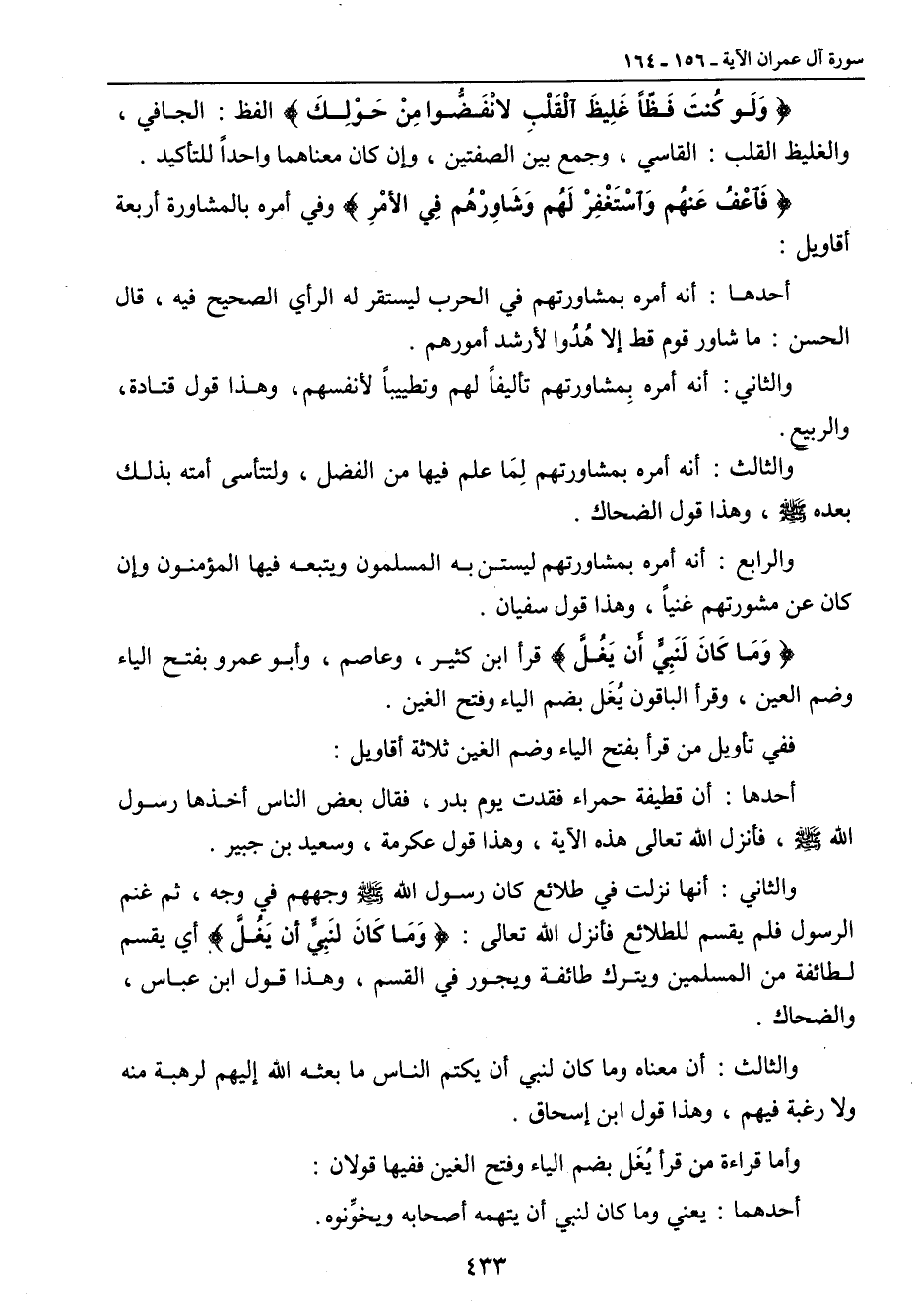 {وَلَو كُنتَ فَظّاً غَلِيظَ الْقَلْبِ لانْفَضُّوا مِنْ حَوْلِكَ} الفظ: الجافي , والغليظ القلب: القاسي , وجمع بين الصفتين , وإن كان معناهما واحداً للتأكيد. {فَاعْفُ عَنهُم وَاسْتَغْفِرْ لَهُم وَشَاوِرْهُم فِي الأمْرِ} وفي أمره بالمشاورة أربعة أقاويل: أحدها: أنه أمره بمشاورتهم في الحرب ليستقر له الرأي الصحيح فيه , قال الحسن: ما شاور قوم قط إلا هُدُوا لأرشد أمورهم. والثاني: أنه أمره بِمشاورتهم تأليفاً لهم وتطيباً لأنفسهم , وهذا قول قتادة , والربيع. والثالث: أنه أمره بمشاورتهم لِمَا علم فيها من الفضل , ولتتأسى أمته بذلك بعده صلى الله عليه وسلم , وهذا قول الضحاك. والرابع: أنه أمره بمشاورتهم ليستن به المسلمون ويتبعه فيها المؤمنون وإن كان عن مشورتهم غنياً , وهذا قول سفيان. {وَمَا كَانَ لِنَبِيٍّ أَن يَغُلَّ} قرأ ابن كثير , وعاصم , وأبو عمرو بفتح الياء وضم العين , وقرأ الباقون يغل بضم الياء وفتح الغين. ففي تأويل من قرأ بفتح الياء وضم الغين ثلاثة أقاويل: أحدها: أن قطيفة حمراء فقدت يوم بدر , فقال بعض الناس أخذها رسول الله صلى الله عليه وسلم , فانزل الله تعالى هذه الآية , وهذا قول عكرمة , وسعيد بن جبير. والثاني: أنها نزلت في طلائع كان رسول الله صلى الله عليه وسلم وجههم في وجه , ثم غنم الرسول فلم يقسم للطلائع فأنزل الله تعالى: {وَمَا كَانَ لنَبِيٍّ أَن يَغُلَّ} أي يقسم لطائفة من المسلمين ويترك طائفة ويجور في القسم , وهذا قول ابن عباس , والضحاك. والثالث: أن معناه وما كان لنبي أن يكتم الناس ما بعثه الله إليهم لرهبة منه ولا رغبة فيهم , وهذا قول ابن إسحاق. وأما قراءة من قرأ يُغّل بضم الياء وفتح الغين ففيها قولان: أحدهما: يعني وما كان لنبي أن يتهمه أصحابه ويخوَّنوه.