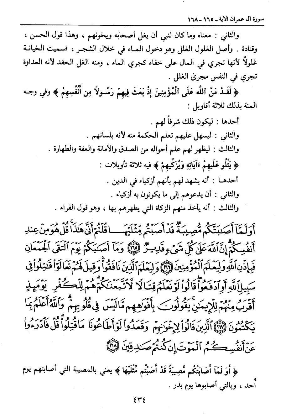 والثاني: معناه وما كان لنبي أن يغل أصحابه ويخونهم , وهذا قول الحسن , وقتادة. وأصل الغلول الغلل وهو دخول الماء في خلال الشجر , فسميت الخيانة غلولاً لأنها تجري في المال على خفاء كجري الماء , ومنه الغل الحقد لأنه العداوة تجري في النفس مجرى الغلل. {لَقَدْ مَنَّ الله عَلَى الْمُؤْمِنِينَ إِذْ بَعَثَ فِيهِمْ رَسُولاً مِن أَنُفُسِهِمْ} وفي وجه المنة بذلك ثلاثة أقاويل: أحدها: ليكون ذلك شرفاً لهم. والثاني: ليسهل عليهم تعلم الحكمة منه لأنه بلسانهم. والثالث: ليظهر لهم علم أحواله من الصدق والأمانة والعفة والطهارة. {يَتْلُو عَلَيهِمْءَآيَاتِهِ وَيُزَكِّيهِمْ} فيه ثلاث تأويلات: أحدها: أنه يشهد لهم بأنهم أزكياء في الدين. والثاني: أن يدعوهم إلى ما يكونون به أزكياء. والثالث: أنه يأخذ منهم الزكاة التي يطهرهم بها , وهو قول الفراء.