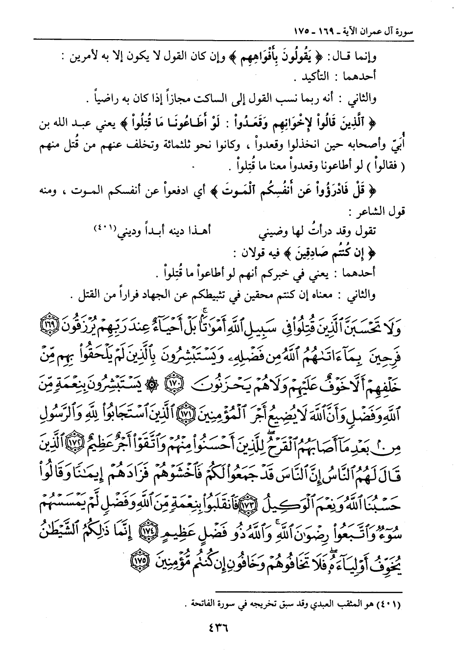 {ولا تحسبن الذين قتلوا في سبيل الله أمواتا بل أحياء عند ربهم يرزقون فرحين بما آتاهم الله من فضله ويستبشرون بالذين لم يلحقوا بهم من خلفهم ألا خوف عليهم ولا هم يحزنون يستبشرون بنعمة من الله وفضل وأن الله لا يضيع أجر المؤمنين الذين استجابوا لله والرسول من بعد ما أصابهم القرح للذين أحسنوا منهم واتقوا أجر عظيم الذين قال لهم الناس إن الناس قد جمعوا لكم فاخشوهم فزادهم إيمانا وقالوا حسبنا الله ونعم الوكيل فانقلبوا بنعمة من الله وفضل لم يمسسهم سوء واتبعوا رضوان الله والله ذو فضل عظيم إنما ذلكم الشيطان يخوف أولياءه فلا تخافوهم وخافون إن كنتم مؤمنين}