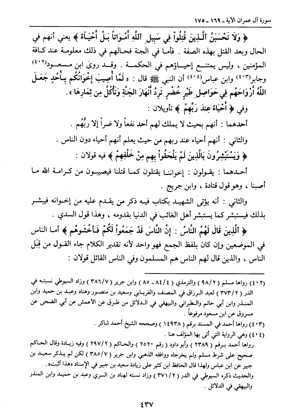 {وَلاَ تَحْسَبَنَّ الَّذِينَ قُتِلُواْ فِي سَبِيلِ اللهِ أَمْوَاتاً بَلْ أَحْيَآءٌ} يعني أنهم في الحال وبعد القتل بهذه الصفة , فأما في الجنة فحالهم في ذلك معلومة عند كافة المؤمنين , وليس يمتنع إحياؤهم في الحكمة. وقد روى ابن مسعود وجابر وابن عباس أن النبي صلى الله عليه وسلم قال: (لَمَّا أُصِيبَ إِخْوَانُكُم بِأُحدٍ جَعَلَ اللهُ أَرْوَاحَهُم فِي حَوَاصِلِ طَيْر خُضْرٍ تَرِدُ أَنْهارَ الجَنَّةِ وَتَأْكُلُ مِن ثِمَارِها). وفي {أَحْيَاءٌ عِندَ رَبِّهِمْ} تأويلان: أحدهما: أنهم بحيث لا يملك لهم أحد نفعاً ولا ضراً إلا ربُّهُم. والثاني: انهم أحياء عند ربهم من حيث يعلم أنهم أحياء دون الناس. {وَيَسْتَبْشِرُونَ بِالَّذِينَ لَمْ يَلْحَقُواْ بِهِم مِنْ خَلْفِهِمْ} فيه قولان: أحدهما: يقولون: إخواننا يقتلون كما قتلنا فيصيبون من كرامة الله ما أصبنا , وهو قول قتادة , وابن جريج. والثاني: أنه يؤتى الشهيد بكتاب فيه ذكر من يقدم عليه من إخوانه فيبشر بذلك فيستبشر كما يستبشر أهل الغائب في الدنيا بقدومه , وهذا قول السدي. {الَّذِينَ قَالَ لَهُمُ النَّاسُ: إِنَّ النَّاسَ قَدْ جَمَعُواْ لَكُمْ فَاخْشَوهُم} أما الناس في الموضعين وإن كان بلفظ الجمع فهو واحد لأنه تقدير الكلام جاء القول من قِبَل الناس , والذين قال لهم الناس هم المسلمون وفي الناس القائل قولان: